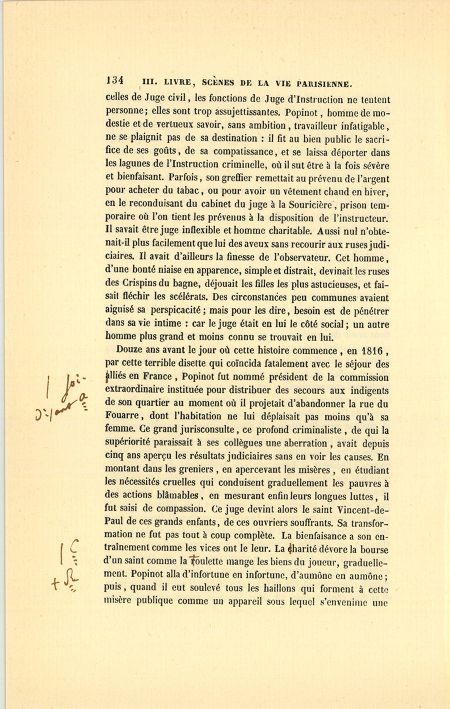 Douze ans avant le jour où cette histoire commence, en 1816, par cette terrible disette qui coïncida fatalement avec le séjour des soi-disant Alliés en France, Popinot fut nommé président de la commission extraordinaire instituée pour distribuer des secours aux indigents de son quartier au moment où il projetait d’abandonner la rue du Fouarre, dont l’habitation ne lui déplaisait pas moins qu’à sa femme. Ce grand jurisconsulte, ce profond criminaliste, de qui la supériorité paraissait à ses collègues une aberration, avait depuis cinq ans aperçu les résultats judiciaires sans en voir les causes. En montant dans les greniers, en apercevant les misères, en étudiant les nécessités cruelles qui conduisent graduellement les pauvres à des actions blâmables, en mesurant enfin leurs longues luttes, il fut saisi de compassion. Ce juge devint alors le saint Vincent-de-Paul de ces grands enfants, de ces ouvriers souffrants. Sa transformation ne fut pas tout à coup complète. La bienfaisance a son entraînement comme les vices ont le leur. La Charité dévore la bourse d’un saint comme la Roulette mange les biens du joueur, graduellement. Popinot alla d’infortune en infortune, d’aumône en aumône ; puis, quand il eut soulevé tous les haillons qui forment à cette misère publique comme un appareil sous lequel s’envenime une {p. 135} plaie fiévreuse, il devint, au bout d’un an, la providence de son quartier. Il fut membre du comité de bienfaisance et du bureau de charité. Partout où des fonctions gratuites étaient à exercer, il acceptait et agissait sans emphase, à la manière de l’homme au petit manteau qui passe sa vie à porter des soupes dans les marchés et dans les endroits où sont les gens affamés. Popinot avait le bonheur d’agir sur une plus vaste circonférence et dans une sphère plus élevée : il veillait à tout, il prévenait le crime, il donnait de l’ouvrage aux ouvriers inoccupés, il faisait placer les impotents, il distribuait ses secours avec discernement sur tous les points menacés, se constituant le conseil de la veuve, le protecteur des enfants sans asile, le commanditaire des petits commerces. Personne au Palais ni dans Paris ne connaissait cette vie secrète de Popinot. Il est des vertus si éclatantes qu’elles comportent l’obscurité : les hommes s’empressent de les mettre sous le boisseau. Quant aux obligés du magistrat, tous, travaillant pendant le jour et fatigués la nuit, étaient peu propres à le prôner ; ils avaient l’ingratitude des enfants, qui ne peuvent jamais s’acquitter parce qu’ils doivent trop. Il y a des ingratitudes forcées ; mais quel cœur a pu semer le bien pour récolter la reconnaissance et se croire grand ? Dès la deuxième année de son apostolat secret, Popinot avait fini par convertir en un parloir le magasin du rez-de-chaussée de sa maison, qui était éclairé par les trois croisées à grilles en fer. Les murs et le plafond de cette grande pièce avaient été blanchis à la chaux, et le mobilier consistait en bancs de bois semblables à ceux des écoles, en une armoire grossière, un bureau de noyer et un fauteuil. Dans l’armoire étaient ses registres de bienfaisance, ses modèles de bons de pain, son journal. Il tenait ses écritures commercialement, afin de ne pas être la dupe de son cœur. Toutes les misères du quartier étaient chiffrées, casées dans un livre où chaque malheur avait son compte, comme chez un marchand les débiteurs divers. Lorsqu’il y avait doute sur une famille, sur un homme à secourir, le magistrat trouvait à ses ordres les renseignements de la police de sûreté. Lavienne, domestique fait pour le maître, était son aide-de-camp. Il dégageait ou renouvelait les reconnaissances du Mont-de-Piété, et courait aux endroits les plus menacés pendant que son maître travaillait au Palais. De quatre à sept heures du matin en été, de six à neuf heures en hiver, cette salle était pleine de femmes, d’enfants, d’indigents, auxquels Popinot {p. 136} donnait audience. Il n’était nullement besoin de poêle en hiver ; la foule abondait si drûment que l’atmosphère devenait chaude ; seulement Lavienne mettait de la paille sur le carreau trop humide. À la longue, les bancs étaient devenus polis comme de l’acajou verni ; puis, à hauteur d’homme, la muraille avait reçu je ne sais quelle sombre peinture appliquée par les haillons et les vêtements délabrés de ces pauvres gens. Ces malheureux aimaient tant Popinot que, quand, avant l’ouverture de sa porte, ils étaient attroupés vers le matin en hiver, les femmes se chauffant avec des gueux, les hommes se brassant pour s’échauffer, jamais un murmure n’avait troublé son sommeil. Les chiffonniers, les gens à état nocturne connaissaient ce logis, et voyaient souvent le cabinet du magistrat éclairé à des heures indues. Enfin les voleurs disaient en passant : Voilà sa maison, et la respectaient. Le matin appartenait aux pauvres, le milieu du jour aux criminels, le soir aux travaux judiciaires.