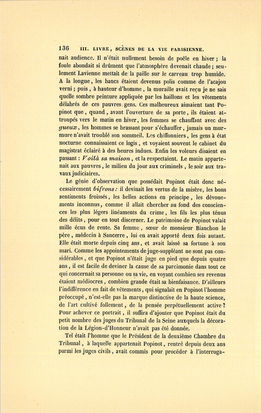 Le génie d’observation que possédait Popinot était donc nécessairement bifrons : il devinait les vertus de la misère, les bons sentiments froissés, les belles actions en principe, les dévouements inconnus, comme il allait chercher au fond des consciences les plus légers linéaments du crime, les fils les plus ténus des délits, pour en tout discerner. Le patrimoine de Popinot valait mille écus de rente. Sa femme, sœur de monsieur Bianchon le père, médecin à Sancerre, lui en avait apporté deux fois autant. Elle était morte depuis cinq ans, et avait laissé sa fortune à son mari. Comme les appointements de juge-suppléant ne sont pas considérables, et que Popinot n’était juge en pied que depuis quatre ans, il est facile de deviner la cause de sa parcimonie dans tout ce qui concernait sa personne ou sa vie, en voyant combien ses revenus étaient médiocres, combien grande était sa bienfaisance. D’ailleurs l’indifférence en fait de vêtements, qui signalait en Popinot l’homme préoccupé, n’est-elle pas la marque distinctive de la haute science, de l’art cultivé follement, de la pensée perpétuellement active ? Pour achever ce portrait, il suffira d’ajouter que Popinot était du petit nombre des juges du Tribunal de la Seine auxquels la décoration de la Légion-d’Honneur n’avait pas été donnée.