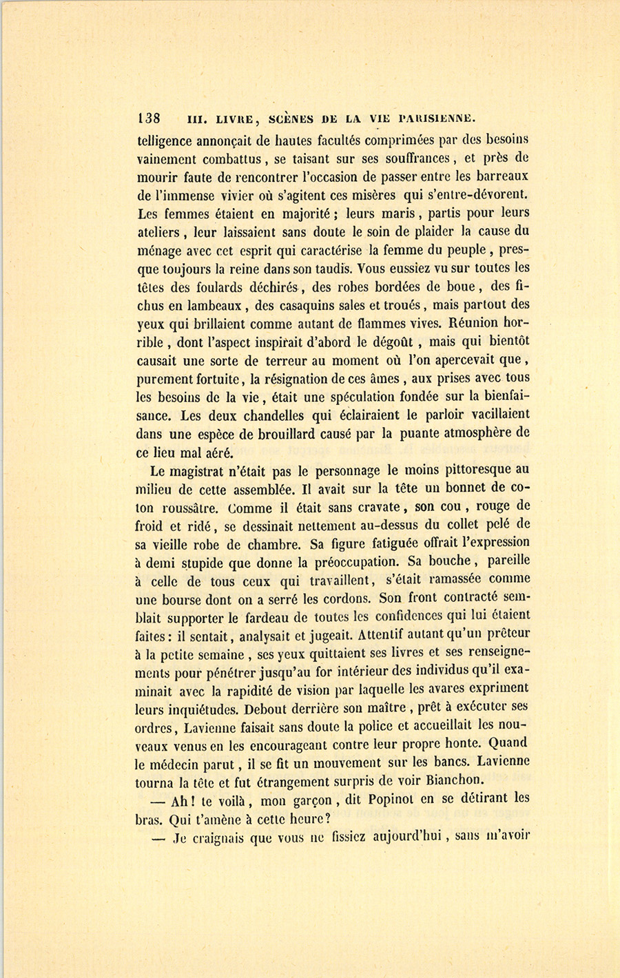 Le magistrat n’était pas le personnage le moins pittoresque au milieu de cette assemblée. Il avait sur la tête un bonnet de coton roussâtre. Comme il était sans cravate, son cou, rouge de froid et ridé, se dessinait nettement au-dessus du collet pelé de sa vieille robe de chambre. Sa figure fatiguée offrait l’expression à demi stupide que donne la préoccupation. Sa bouche, pareille à celle de tous ceux qui travaillent, s’était ramassée comme une bourse dont on a serré les cordons. Son front contracté semblait supporter le fardeau de toutes les confidences qui lui étaient faites : il sentait, analysait et jugeait. Attentif autant qu’un prêteur à la petite semaine, ses yeux quittaient ses livres et ses renseignements pour pénétrer jusqu’au for intérieur des individus qu’il examinait avec la rapidité de vision par laquelle les avares expriment leurs inquiétudes. Debout derrière son maître, prêt à exécuter ses ordres, Lavienne faisait sans doute la police et accueillait les nouveaux venus en les encourageant contre leur propre honte. Quand le médecin parut, il se fit un mouvement sur les bancs. Lavienne tourna la tête et fut étrangement surpris de voir Bianchon.