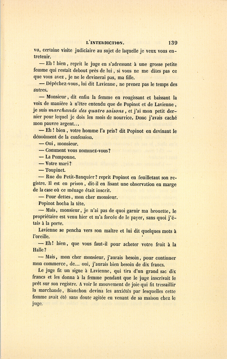 – Monsieur, dit enfin la femme en rougissant et baissant la voix de manière à n’être entendu que de Popinot et de Lavienne, je suis marchande des quatre saisons, et j’ai mon petit dernier pour lequel je dois les mois de nourrice. Donc j’avais caché mon pauvre argent…