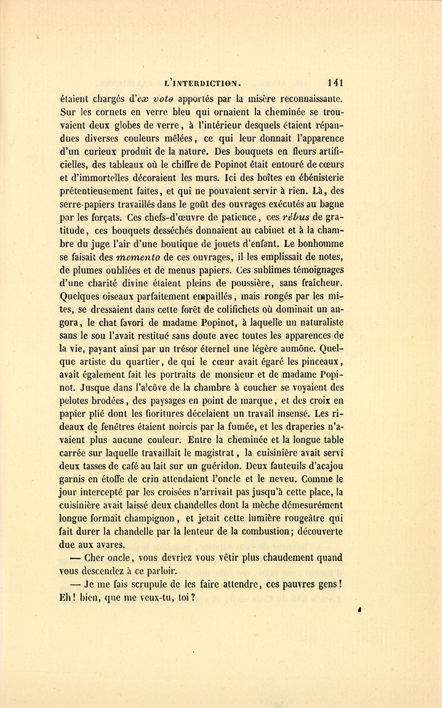 Depuis que l’œil et la main d’une femme y manquaient, l’appartement où demeurait Popinot avait pris une physionomie en harmonie avec celle du maître. L’incurie de l’homme emporté par une pensée dominante imprimait son cachet bizarre en toutes choses. Partout une poussière invétérée, partout dans les objets ces changements de destination dont l’industrie rappelait celle des ménages de garçon. C’était des papiers dans des vases de fleurs, des bouteilles d’encre vides sur les meubles, des assiettes oubliées, des briquets phosphoriques convertis en bougeoirs au moment où il fallait faire une recherche, des déménagements partiels commencés et oubliés, enfin tous les encombrements et les vides occasionnés par des pensées de rangement abandonnées. Mais le cabinet du magistrat, particulièrement remué par ce désordre incessant, accusait sa marche sans haltes, l’entraînement de l’homme accablé d’affaires, poursuivi par des nécessités qui se croisent. La bibliothèque était comme au pillage, les livres traînaient, les uns empilés le dos dans les pages ouvertes, les autres tombés les feuillets contre terre ; les dossiers de procédure disposés en ligne, le long du corps de la bibliothèque, encombraient le parquet. Ce parquet n’avait pas été frotté depuis deux ans. Les tables et les meubles {p. 141} étaient chargés d’ex voto apportés par la misère reconnaissante. Sur les cornets en verre bleu qui ornaient la cheminée se trouvaient deux globes de verre, à l’intérieur desquels étaient répandues diverses couleurs mêlées, ce qui leur donnait l’apparence d’un curieux produit de la nature. Des bouquets en fleurs artificielles, des tableaux où le chiffre de Popinot était entouré de cœurs et d’immortelles décoraient les murs. Ici des boîtes en ébénisterie prétentieusement faites, et qui ne pouvaient servir à rien. Là, des serre-papiers travaillés dans le goût des ouvrages exécutés au bagne par les forçats. Ces chefs-d’œuvre de patience, ces rébus de gratitude, ces bouquets desséchés donnaient au cabinet et à la chambre du juge l’air d’une boutique de jouets d’enfant. Le bonhomme se faisait des memento de ces ouvrages, il les emplissait de notes, de plumes oubliées et de menus papiers. Ces sublimes témoignages d’une charité divine étaient pleins de poussière, sans fraîcheur. Quelques oiseaux parfaitement empaillés, mais rongés par les mites, se dressaient dans cette forêt de colifichets où dominait un angora, le chat favori de madame Popinot, à laquelle un naturaliste sans le sou l’avait restitué sans doute avec toutes les apparences de la vie, payant ainsi par un trésor éternel une légère aumône. Quelque artiste du quartier, de qui le cœur avait égaré les pinceaux, avait également fait les portraits de monsieur et de madame Popinot. Jusque dans l’alcôve de la chambre à coucher se voyaient des pelotes brodées, des paysages en point de marque, et des croix en papier plié dont les fioritures décelaient un travail insensé. Les rideaux de fenêtres étaient noircis par la fumée, et les draperies n’avaient plus aucune couleur. Entre la cheminée et la longue table carrée sur laquelle travaillait le magistrat, la cuisinière avait servi deux tasses de café au lait sur un guéridon. Deux fauteuils d’acajou garnis en étoffe de crin attendaient l’oncle et le neveu. Comme le jour intercepté par les croisées n’arrivait pas jusqu’à cette place, la cuisinière avait laissé deux chandelles dont la mèche démesurément longue formait champignon, et jetait cette lumière rougeâtre qui fait durer la chandelle par la lenteur de la combustion ; découverte due aux avares.