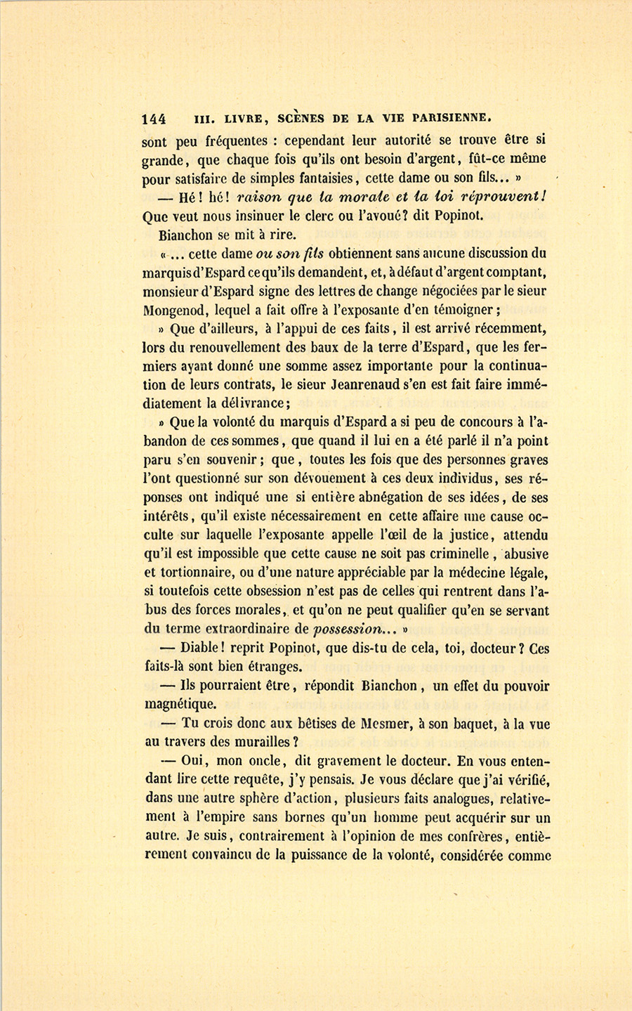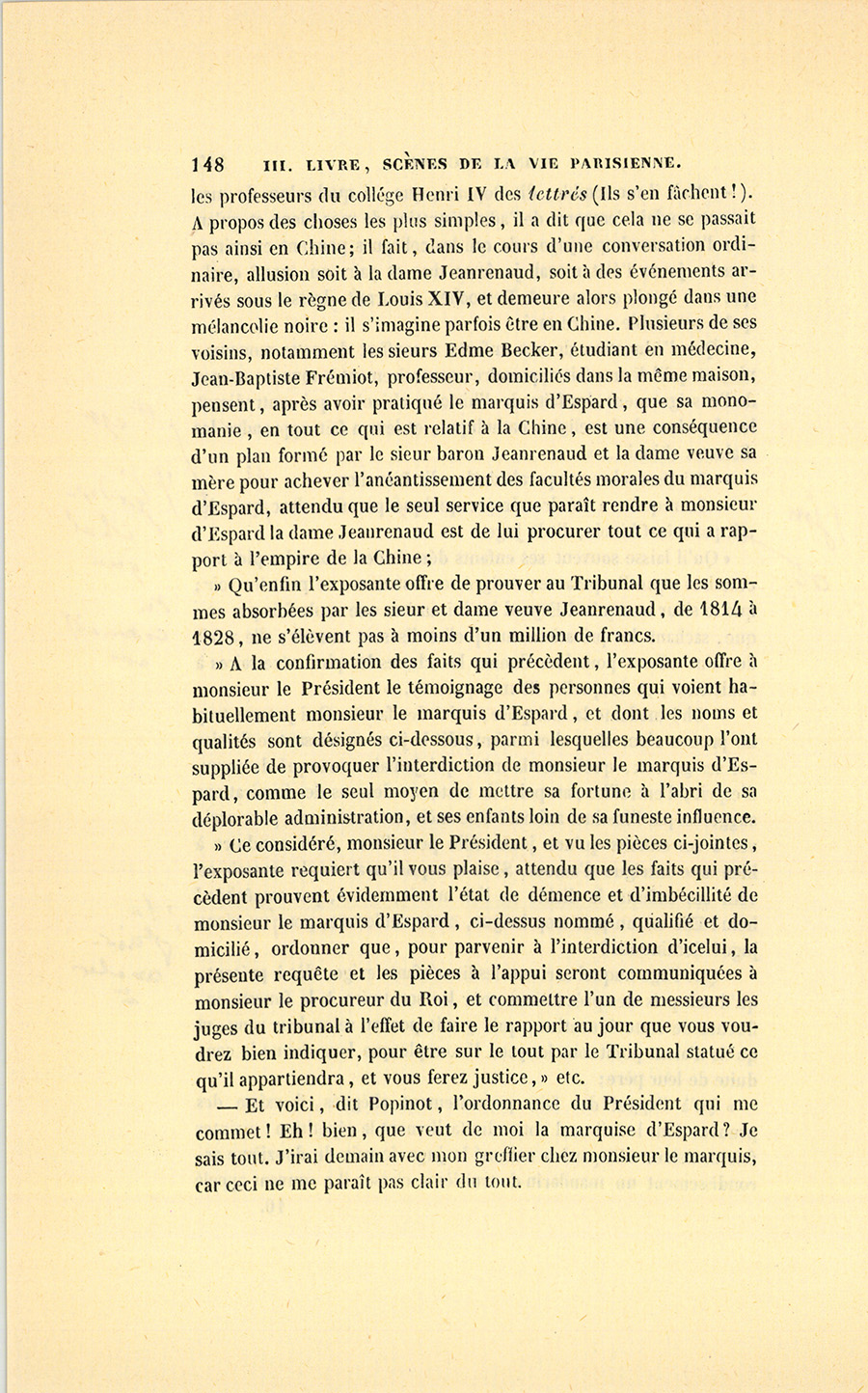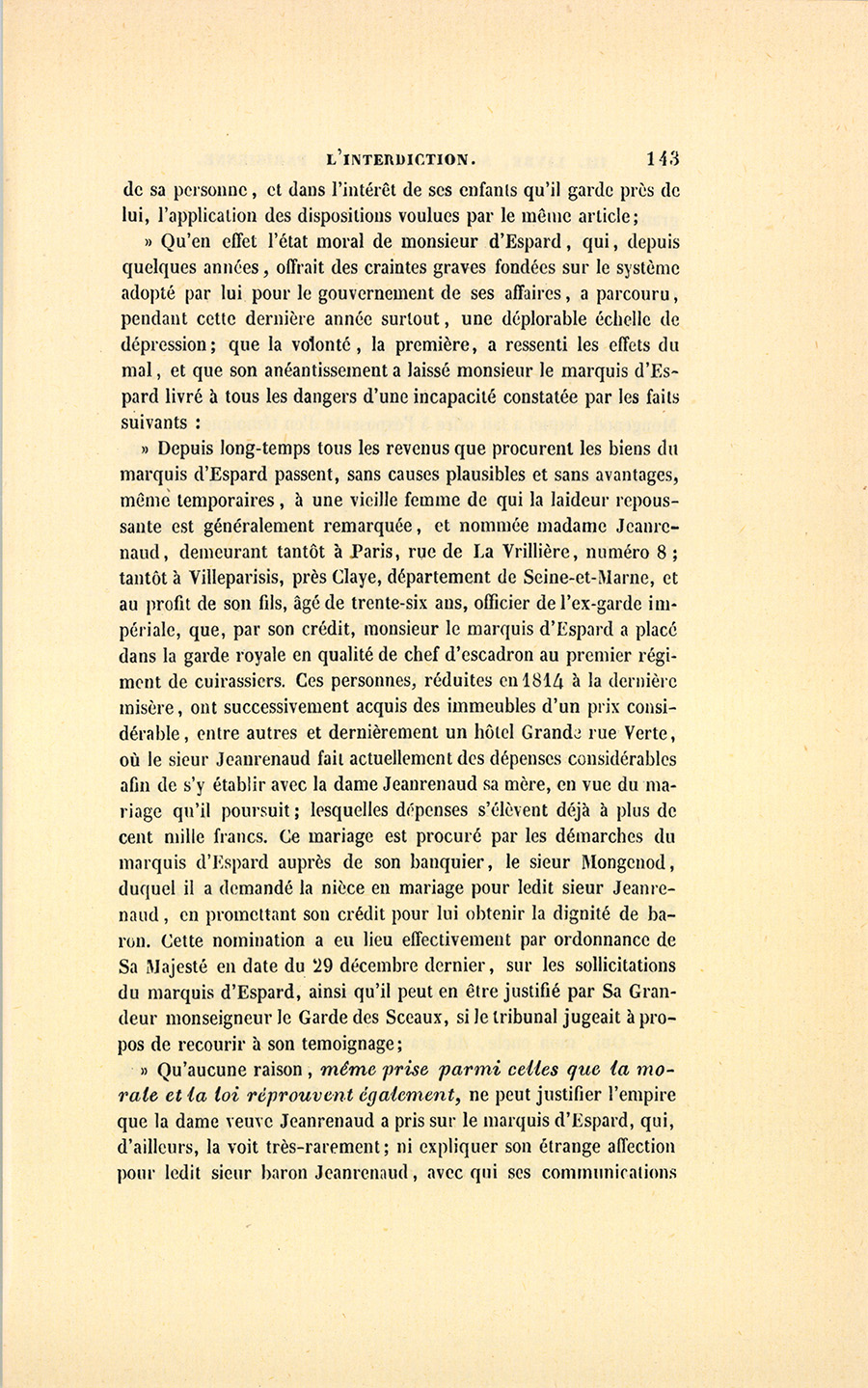 Qu’aucune raison, même prise parmi celles que la morale et la loi réprouvent également, ne peut justifier l’empire que la dame veuve Jeanrenaud a pris sur le marquis d’Espard, qui, d’ailleurs, la voit très-rarement ; ni expliquer son étrange affection pour ledit sieur baron Jeanrenaud, avec qui ses communications {p. 144} sont peu fréquentes : cependant leur autorité se trouve être si grande, que chaque fois qu’ils ont besoin d’argent, fût-ce même pour satisfaire de simples fantaisies, cette dame ou son fils…
