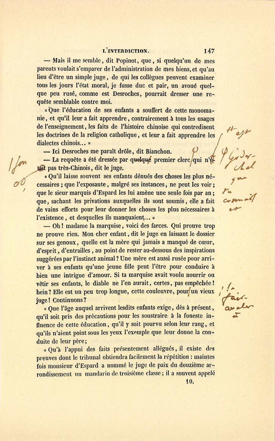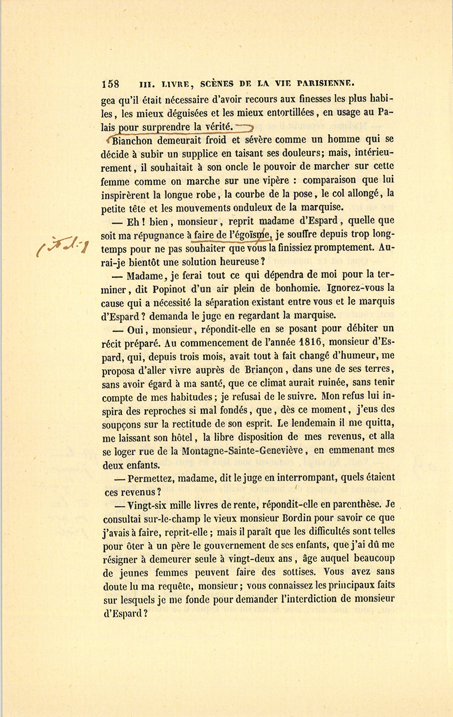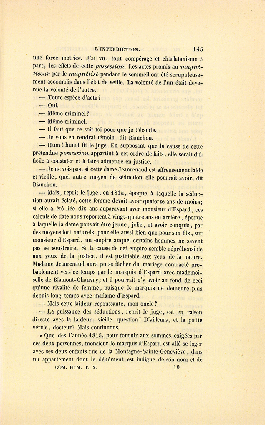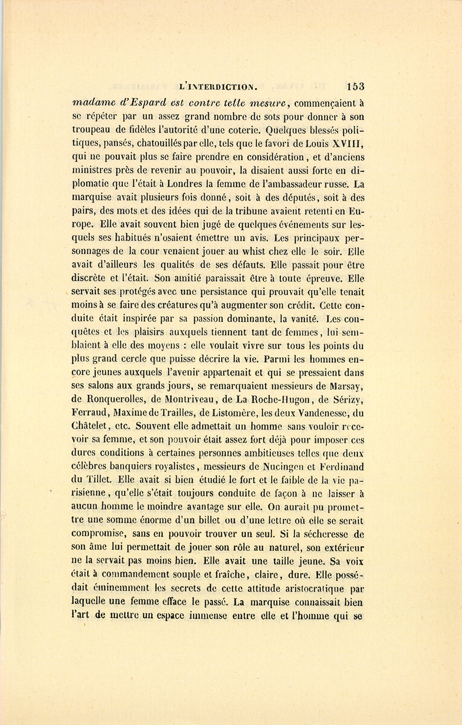 Qu’aucune raison, même prise parmi celles que la morale et la loi réprouvent également, ne peut justifier l’empire que la dame veuve Jeanrenaud a pris sur le marquis d’Espard, qui, d’ailleurs, la voit très-rarement ; ni expliquer son étrange affection pour ledit sieur baron Jeanrenaud, avec qui ses communications {p. 144} sont peu fréquentes : cependant leur autorité se trouve être si grande, que chaque fois qu’ils ont besoin d’argent, fût-ce même pour satisfaire de simples fantaisies, cette dame ou son fils…