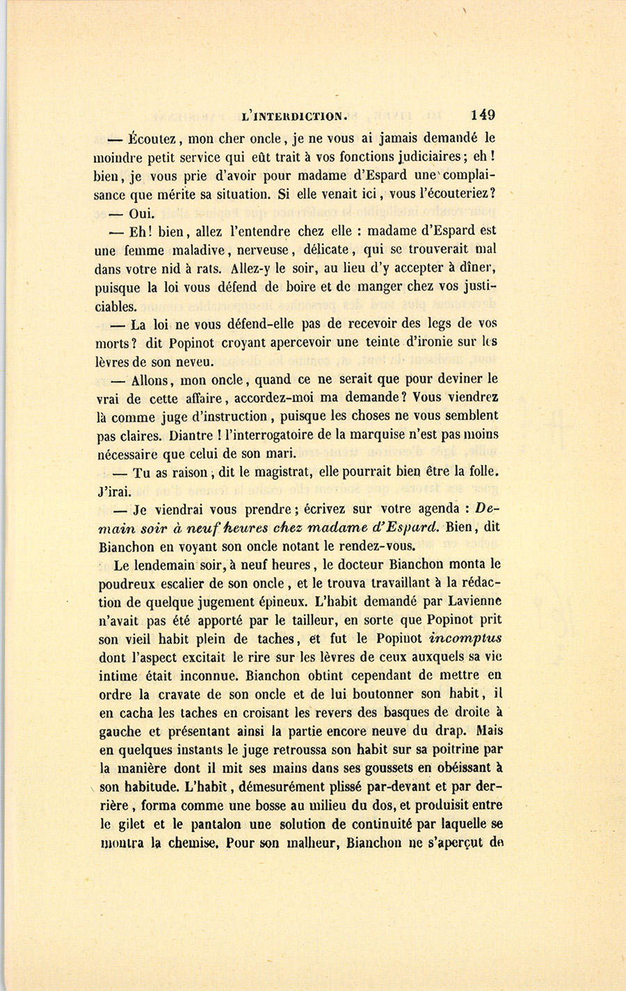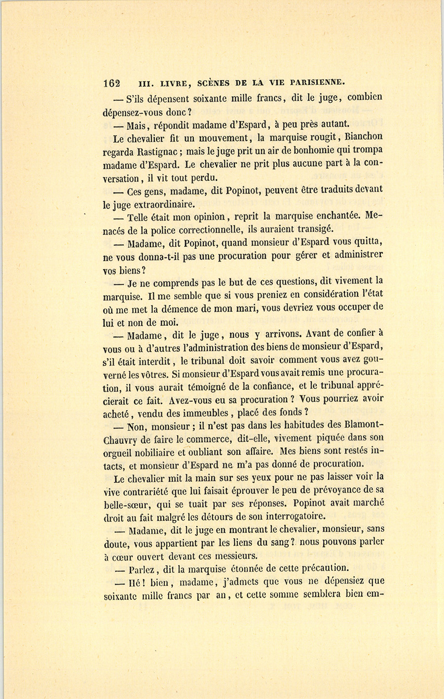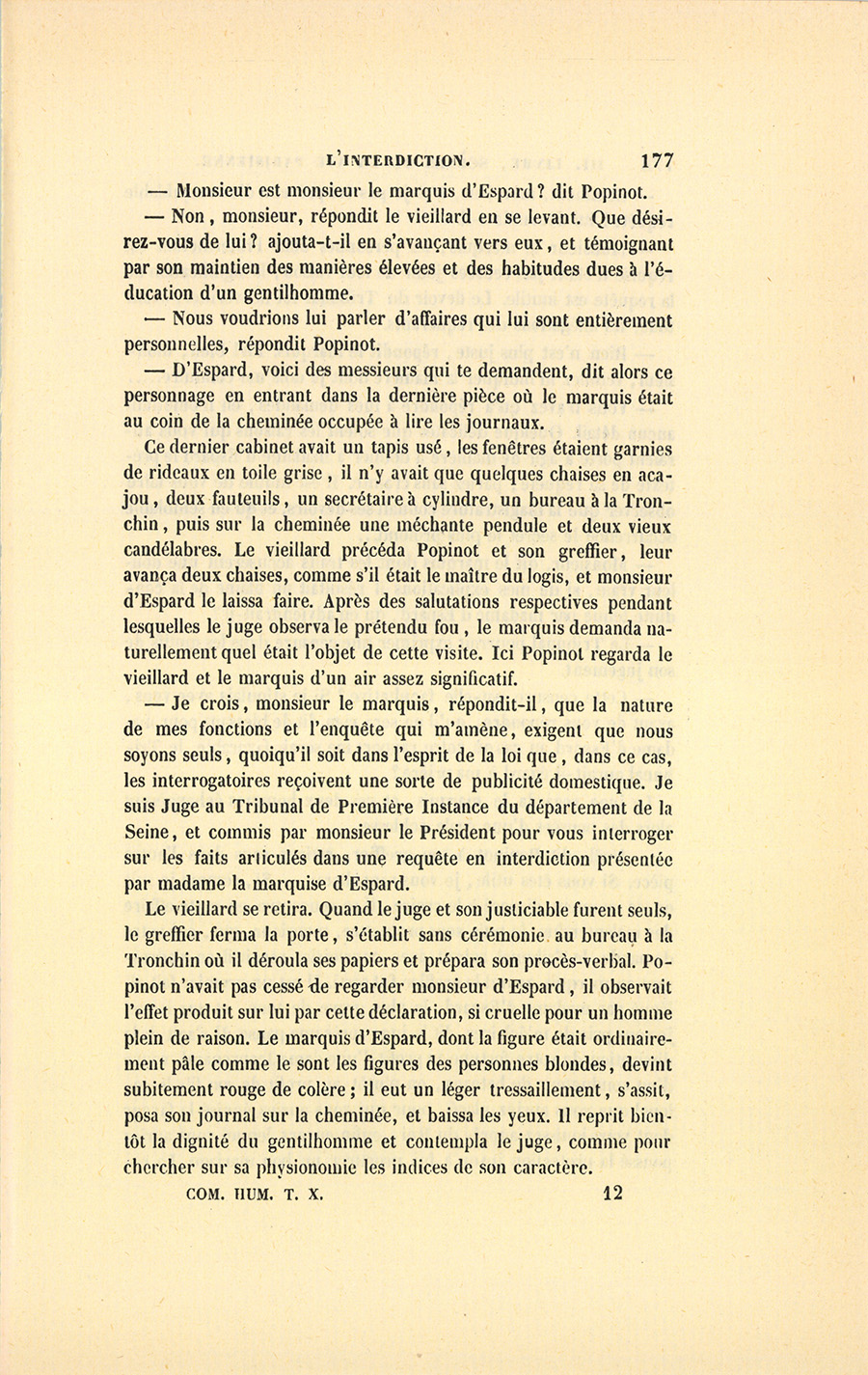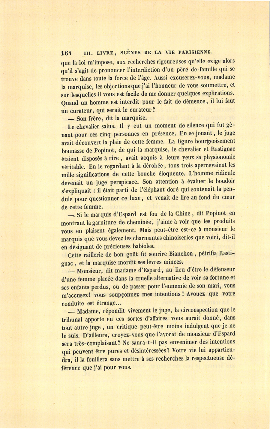 Tel était l’homme que le Président de la deuxième Chambre du Tribunal, à laquelle appartenait Popinot, rentré depuis deux ans parmi les juges civils, avait commis pour procéder à {p. 137} l’interrogatoire du marquis d’Espard, sur la requête présentée par sa femme afin d’obtenir une interdiction.