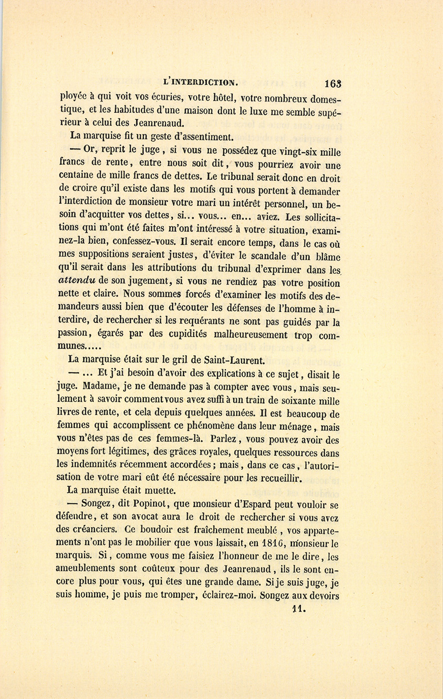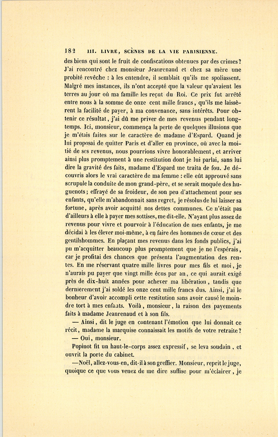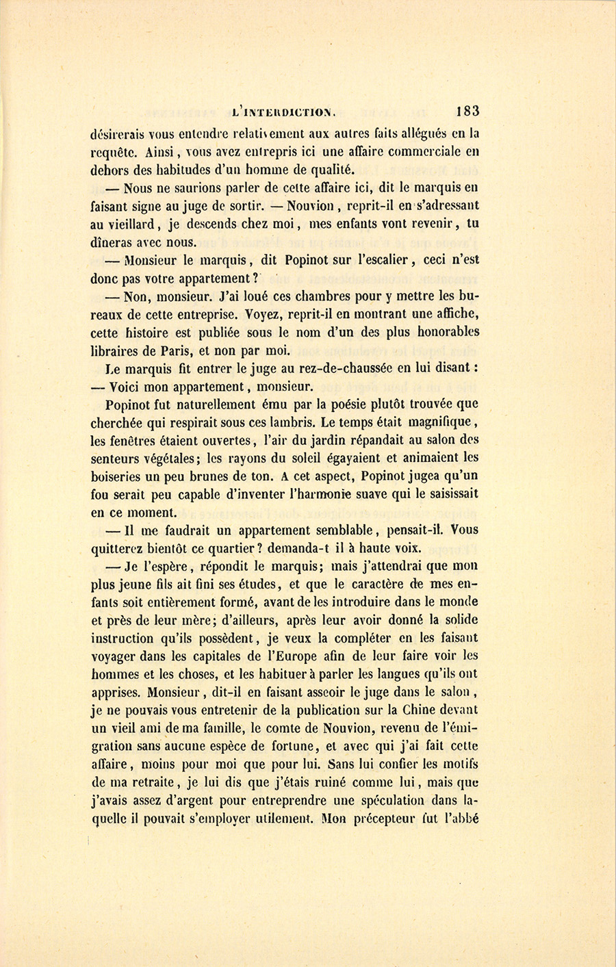 – Noël, allez-vous-en, dit-il à son greffier. Monsieur, reprit le juge, quoique ce que vous venez de me dire suffise pour m’éclairer, je {p. 183} désirerais vous entendre relativement aux autres faits allégués en la requête. Ainsi, vous avez entrepris ici une affaire commerciale en dehors des habitudes d’un homme de qualité.