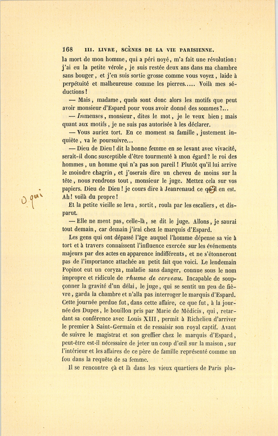 Les gens qui ont dépassé l’âge auquel l’homme dépense sa vie à tort et à travers connaissent l’influence exercée sur les événements majeurs par des actes en apparence indifférents, et ne s’étonneront pas de l’importance attachée au petit fait que voici. Le lendemain Popinot eut un coryza, maladie sans danger, connue sous le nom impropre et ridicule de rhume de cerveau. Incapable de soupçonner la gravité d’un délai, le juge, qui se sentit un peu de fièvre, garda la chambre et n’alla pas interroger le marquis d’Espard. Cette journée perdue fut, dans cette affaire, ce que fut, à la journée des Dupes, le bouillon pris par Marie de Médicis, qui, retardant sa conférence avec Louis XIII, permit à Richelieu d’arriver le premier à Saint-Germain et de ressaisir son royal captif. Avant de suivre le magistrat et son greffier chez le marquis d’Espard, peut-être est-il nécessaire de jeter un coup d’œil sur la maison, sur l’intérieur et les affaires de ce père de famille représenté comme un fou dans la requête de sa femme.