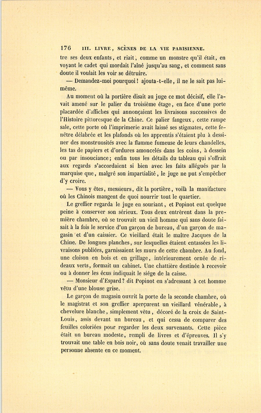 Le greffier regarda le juge en souriant, et Popinot eut quelque peine à conserver son sérieux. Tous deux entrèrent dans la première chambre, où se trouvait un vieil homme qui sans doute faisait à la fois le service d’un garçon de bureau, d’un garçon de magasin et d’un caissier. Ce vieillard était le maître Jacques de la Chine. De longues planches, sur lesquelles étaient entassées les livraisons publiées, garnissaient les murs de cette chambre. Au fond, une cloison en bois et en grillage, intérieurement ornée de rideaux verts, formait un cabinet. Une chattière destinée à recevoir ou à donner les écus indiquait le siége de la caisse.