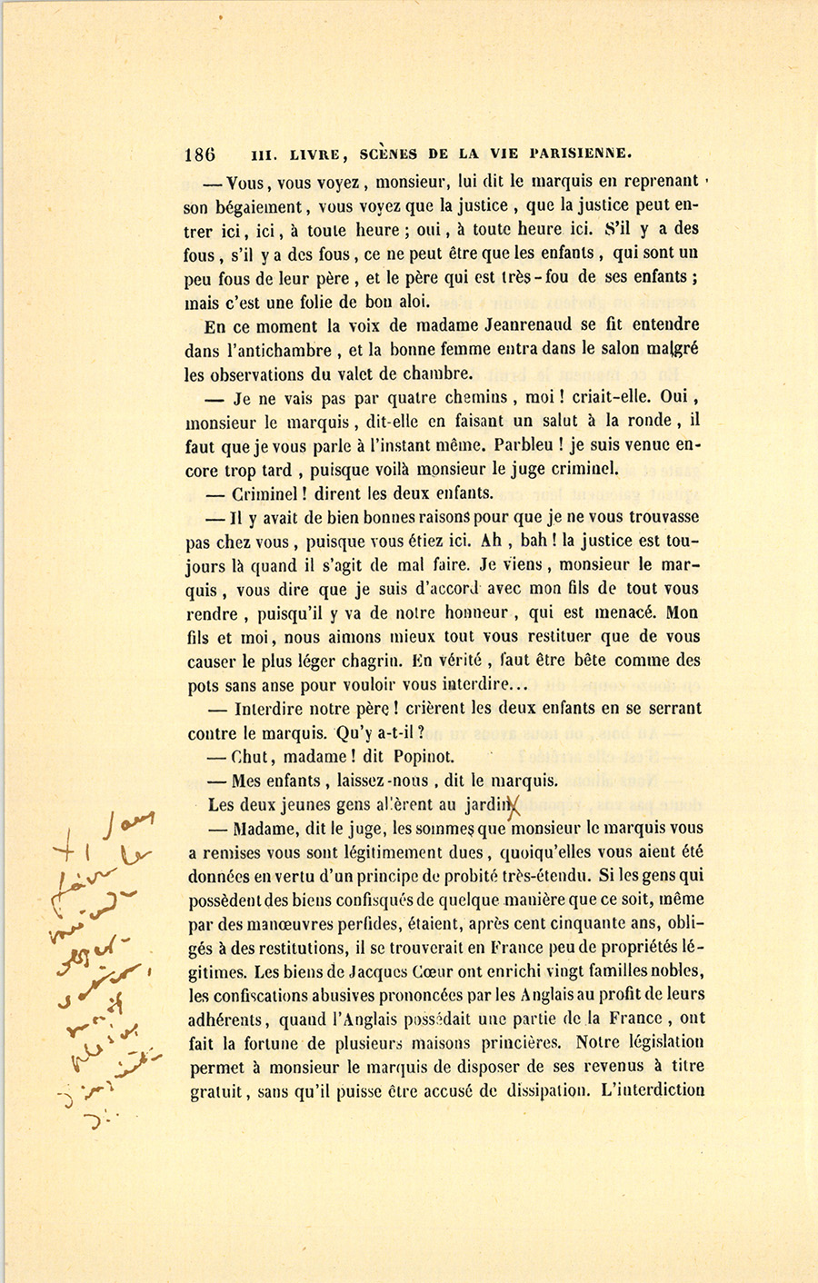 {p. 186} – Vous, vous voyez, monsieur, lui dit le marquis en reprenant son bégaiement, vous voyez que la justice, que la justice peut entrer ici, ici, à toute heure ; oui, à toute heure ici. S’il y a des fous, s’il y a des fous, ce ne peut être que les enfants, qui sont un peu fous de leur père, et le père qui est très-fou de ses enfants ; mais c’est une folie de bon aloi.