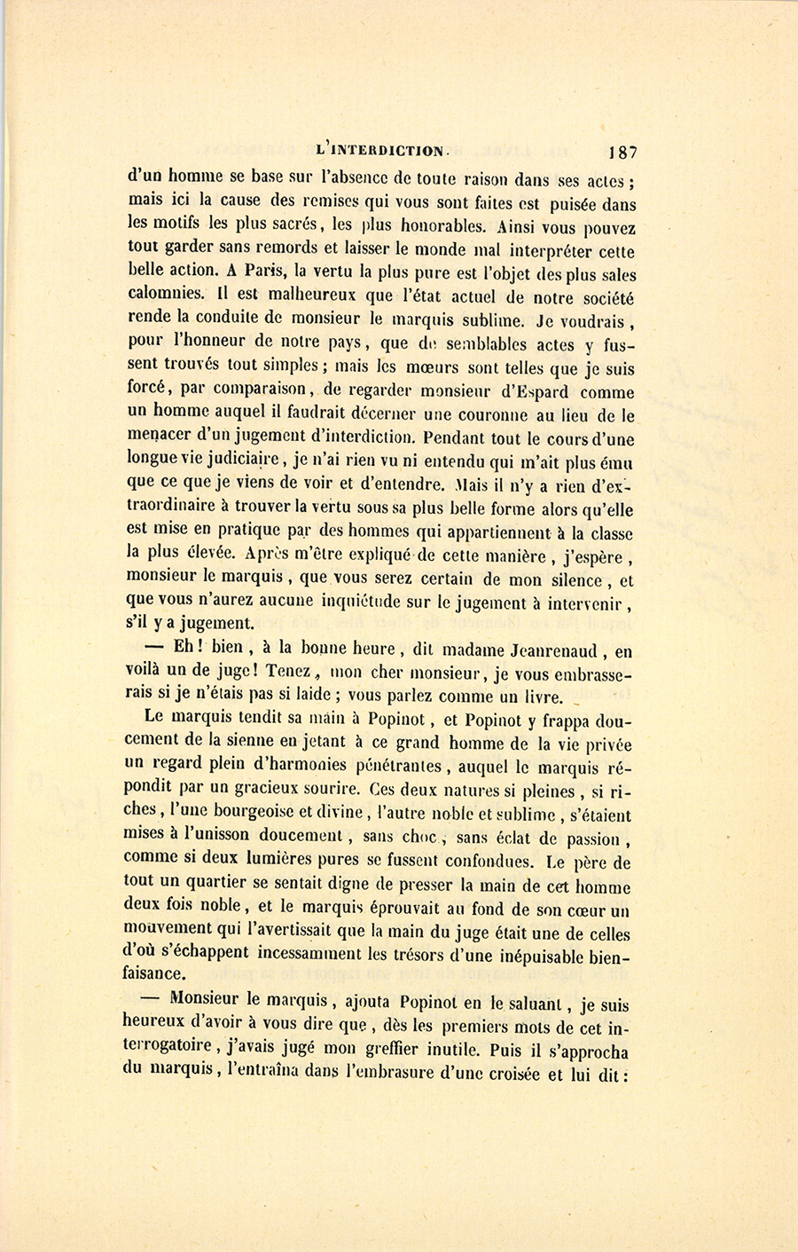 – Madame, dit le juge, les sommes que monsieur le marquis vous a remises vous sont légitimement dues, quoiqu’elles vous aient été données en vertu d’un principe de probité très-étendu. Si les gens qui possèdent des biens confisqués de quelque manière que ce soit, même par des manœuvres perfides, étaient, après cent cinquante ans, obligés à des restitutions, il se trouverait en France peu de propriétés légitimes. Les biens de Jacques Cœur ont enrichi vingt familles nobles, les confiscations abusives prononcées par les Anglais au profit de leurs adhérents, quand l’Anglais possédait une partie de la France, ont fait la fortune de plusieurs maisons princières. Notre législation permet à monsieur le marquis de disposer de ses revenus à titre gratuit, sans qu’il puisse être accusé de dissipation. L’interdiction {p. 187} d’un homme se base sur l’absence de toute raison dans ses actes ; mais ici la cause des remises qui vous sont faites est puisée dans les motifs les plus sacrés, les plus honorables. Ainsi vous pouvez tout garder sans remords et laisser le monde mal interpréter cette belle action. À Paris, la vertu la plus pure est l’objet des plus sales calomnies. Il est malheureux que l’état actuel de notre société rende la conduite de monsieur le marquis sublime. Je voudrais, pour l’honneur de notre pays, que de semblables actes y fussent trouvés tout simples ; mais les mœurs sont telles que je suis forcé, par comparaison, de regarder monsieur d’Espard comme un homme auquel il faudrait décerner une couronne au lieu de le menacer d’un jugement d’interdiction. Pendant tout le cours d’une longue vie judiciaire, je n’ai rien vu ni entendu qui m’ait plus ému que ce que je viens de voir et d’entendre. Mais il n’y a rien d’extraordinaire à trouver la vertu sous sa plus belle forme alors qu’elle est mise en pratique par des hommes qui appartiennent à la classe la plus élevée. Après m’être expliqué de cette manière, j’espère, monsieur le marquis, que vous serez certain de mon silence, et que vous n’aurez aucune inquiétude sur le jugement à intervenir, s’il y a jugement.