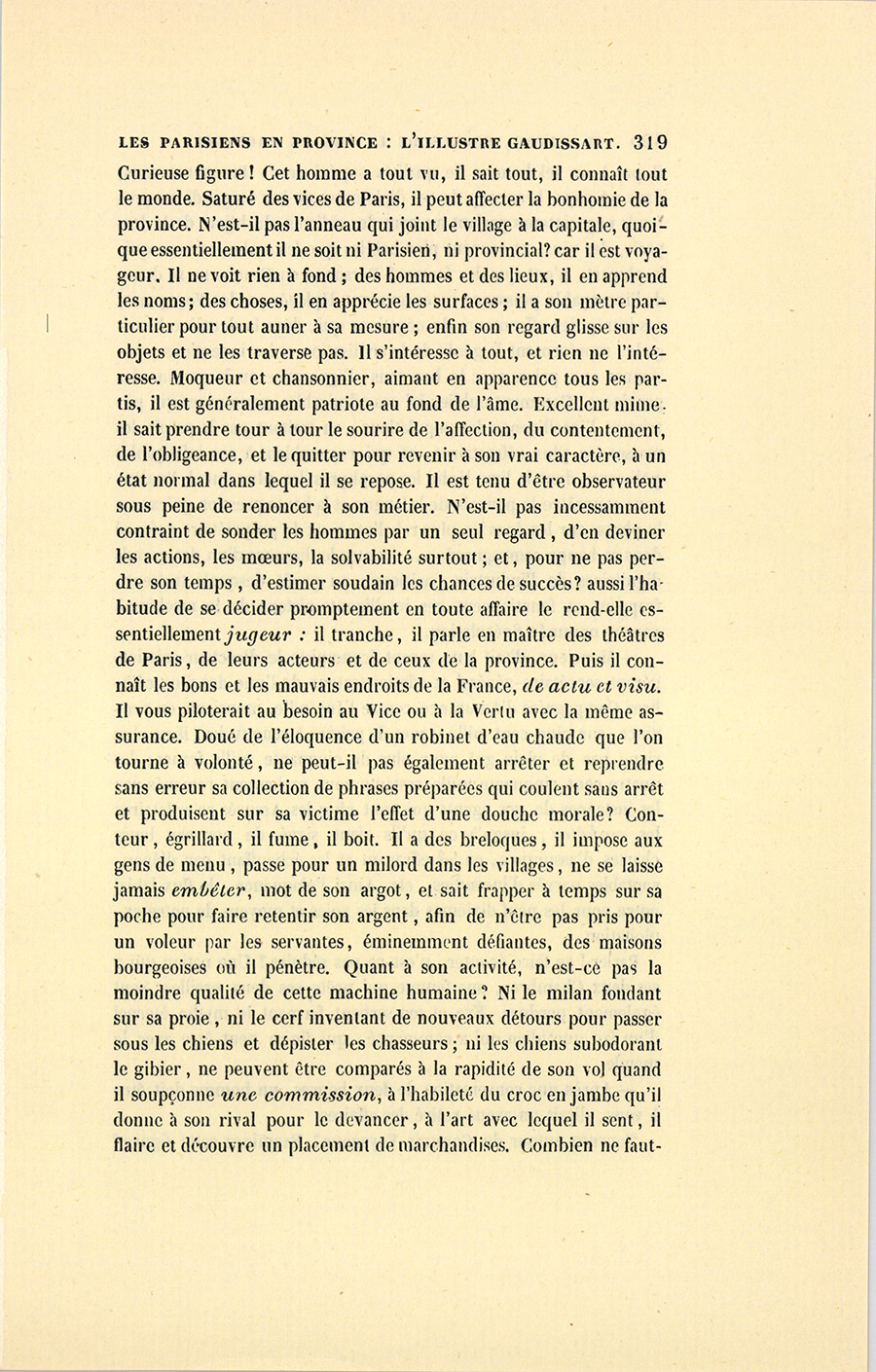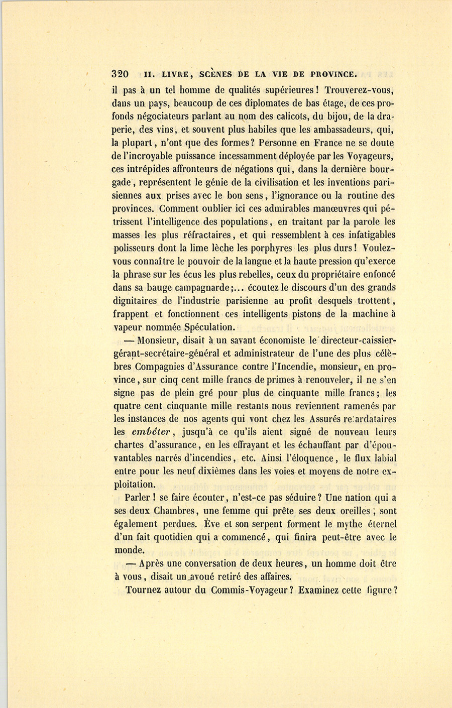 Tournez autour du Commis-Voyageur ? Examinez cette figure ? {p. 321} N’en oubliez ni la redingote olive, ni le manteau, ni le col en maroquin, ni la pipe, ni la chemise de calicot à raies bleues. Dans cette figure, si originale qu’elle résiste au frottement, combien de natures diverses ne découvrirez-vous pas ? Voyez ! quel athlète, quel cirque, quelles armes : lui, le monde et sa langue. Intrépide marin, il s’embarque, muni de quelques phrases, pour aller pêcher cinq à six cent mille francs en des mers glacées, au pays des Iroquois, en France ! Ne s’agit-il pas d’extraire, par des opérations purement intellectuelles, l’or enfoui dans les cachettes de province, de l’en extraire sans douleur ! Le poisson départemental ne souffre ni le harpon ni les flambeaux, et ne se prend qu’à la nasse, à la seine, aux engins les plus doux. Penserez-vous maintenant sans frémir au déluge des phrases qui recommence ses cascades au point du jour, en France ? Vous connaissez le Genre, voici l’Individu.