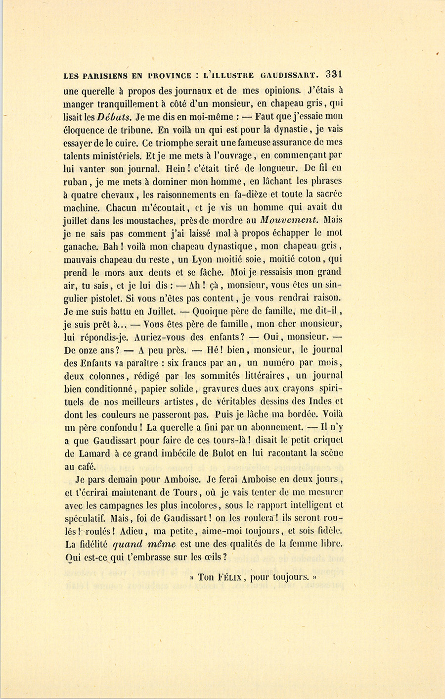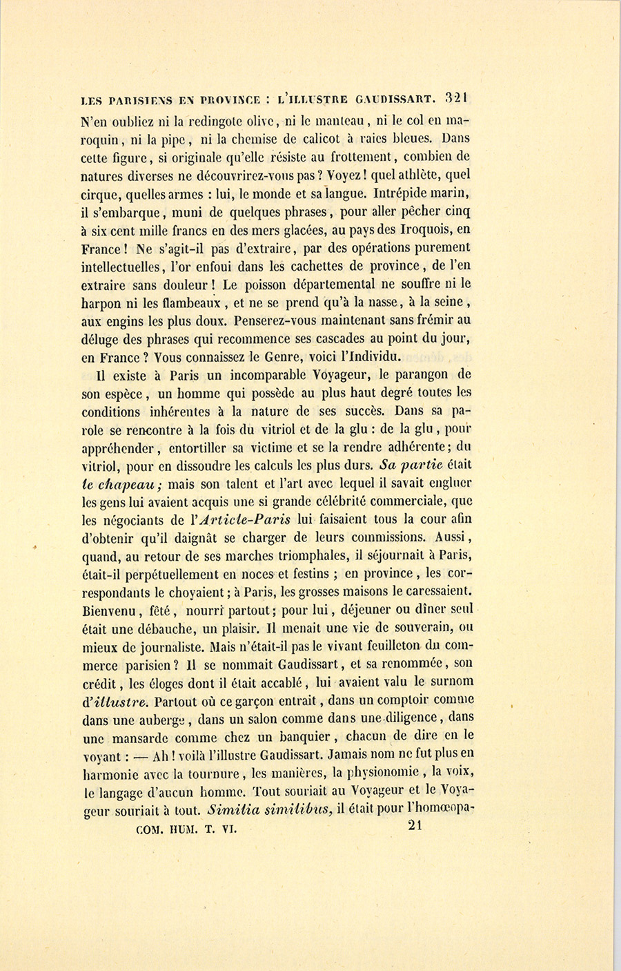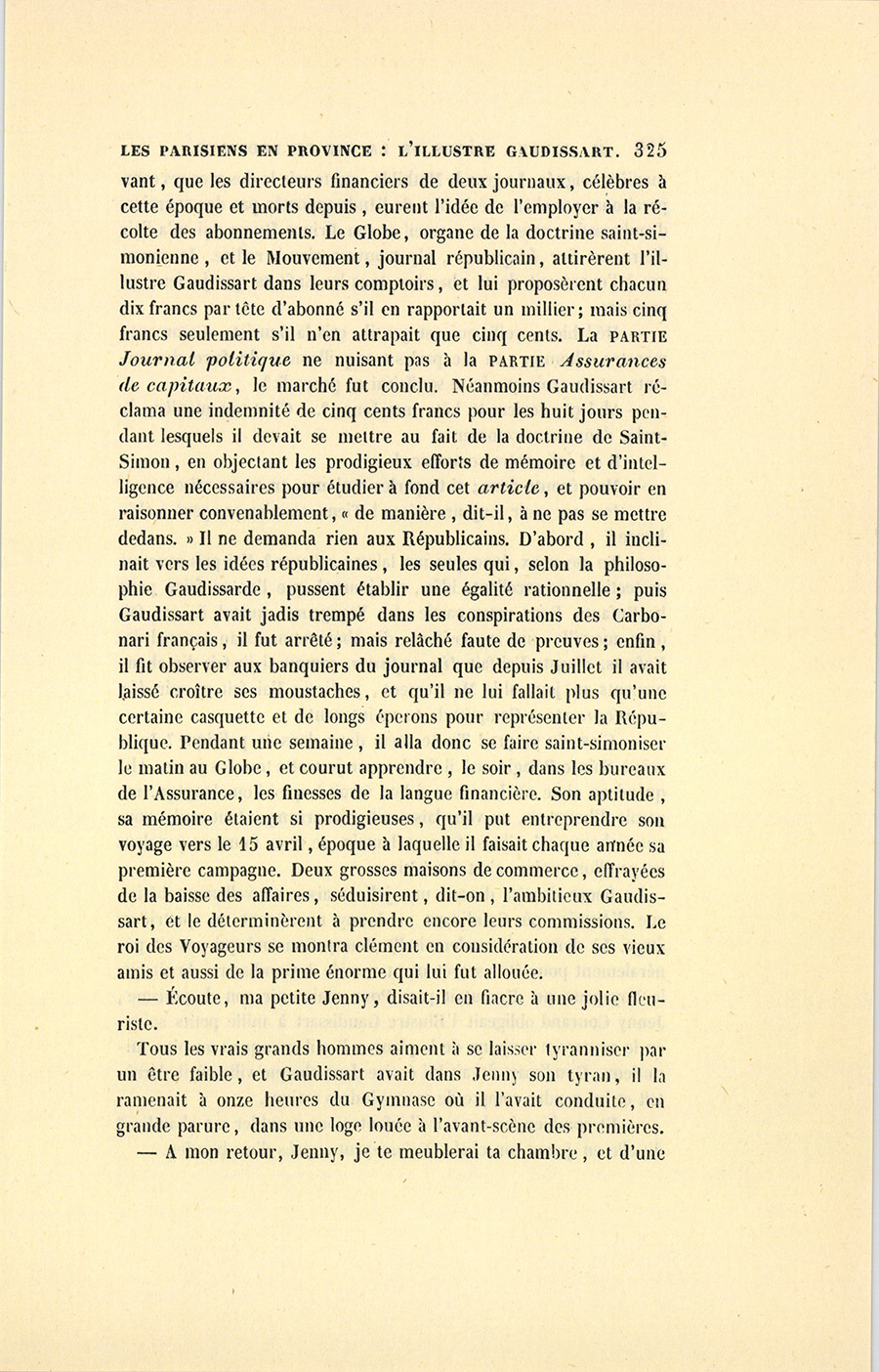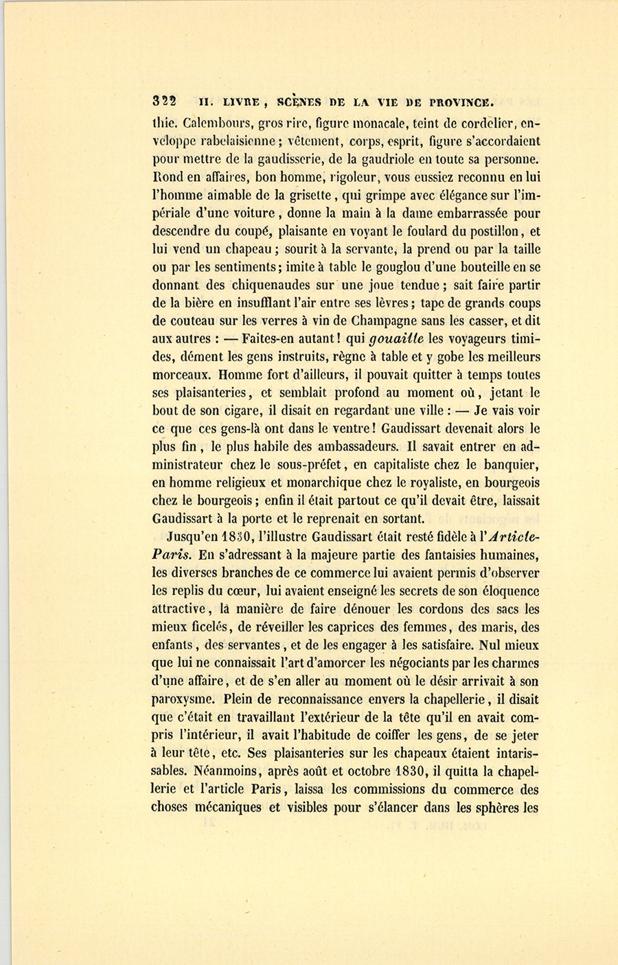 Jusqu’en 1830, l’illustre Gaudissart était resté fidèle à l’Article-Paris. En s’adressant à la majeure partie des fantaisies humaines, les diverses branches de ce commerce lui avaient permis d’observer les replis du cœur, lui avaient enseigné les secrets de son éloquence attractive, la manière de faire dénouer les cordons des sacs les mieux ficelés, de réveiller les caprices des femmes, des maris, des enfants, des servantes, et de les engager à les satisfaire. Nul mieux que lui ne connaissait l’art d’amorcer les négociants par les charmes d’une affaire, et de s’en aller au moment où le désir arrivait à son paroxysme. Plein de reconnaissance envers la chapellerie, il disait que c’était en travaillant l’extérieur de la tête qu’il en avait compris l’intérieur, il avait l’habitude de coiffer les gens, de se jeter à leur tête, etc. Ses plaisanteries sur les chapeaux étaient intarissables. Néanmoins, après août et octobre 1830, il quitta la chapellerie et l’article Paris, laissa les commissions du commerce des choses mécaniques et visibles pour s’élancer dans les sphères les {p. 323} plus élevées de la spéculation parisienne. Il abandonna, disait-il, la matière pour la pensée, les produits manufacturés pour les élaborations infiniment plus pures de l’intelligence. Ceci veut une explication.