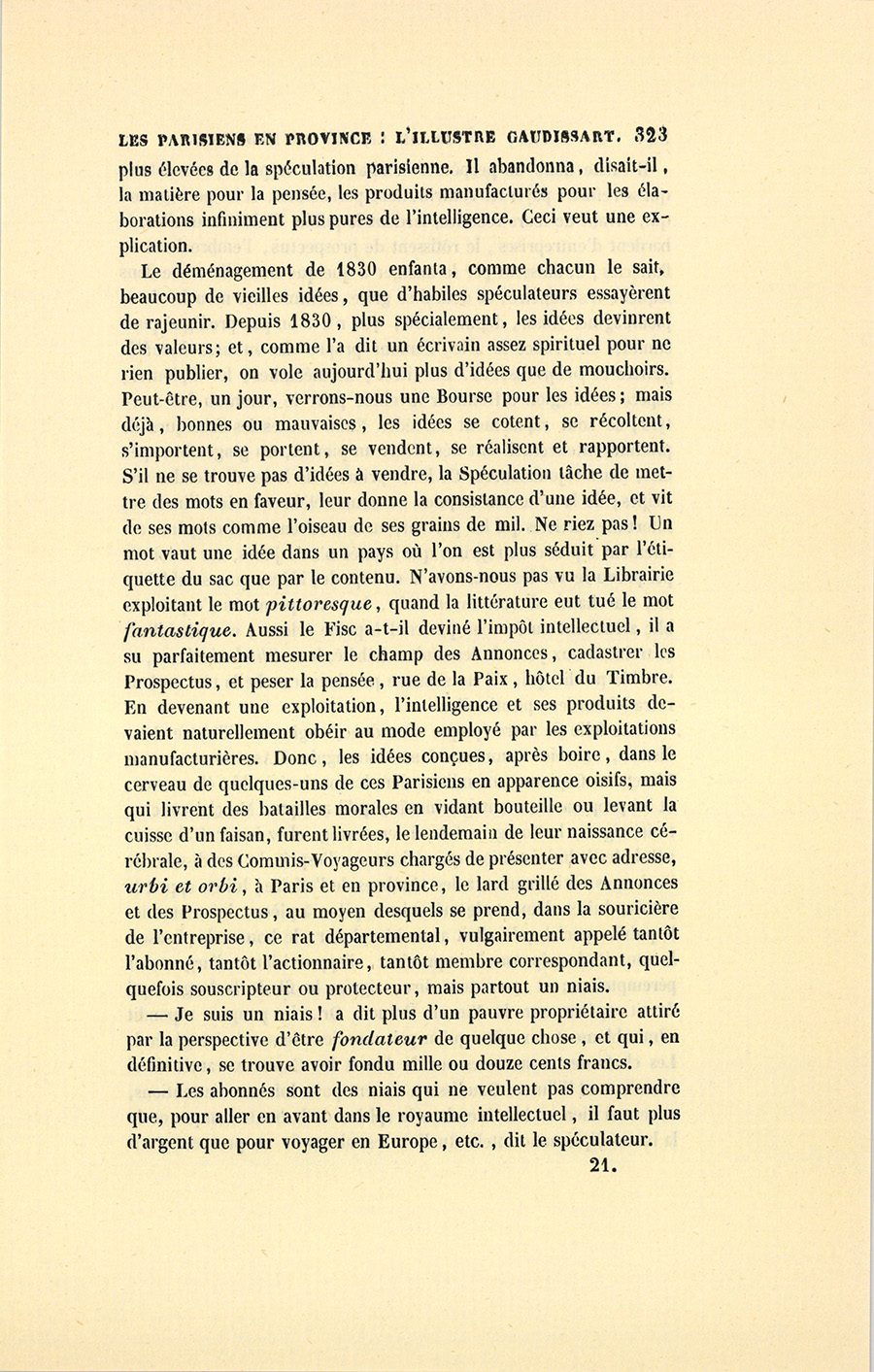 Le déménagement de 1830 enfanta, comme chacun le sait, beaucoup de vieilles idées, que d’habiles spéculateurs essayèrent de rajeunir. Depuis 1830, plus spécialement, les idées devinrent des valeurs ; et, comme l’a dit un écrivain assez spirituel pour ne rien publier, on vole aujourd’hui plus d’idées que de mouchoirs. Peut-être, un jour, verrons-nous une Bourse pour les idées ; mais déjà, bonnes ou mauvaises, les idées se cotent, se récoltent, s’importent, se portent, se vendent, se réalisent et rapportent. S’il ne se trouve pas d’idées à vendre, la Spéculation tâche de mettre des mots en faveur, leur donne la consistance d’une idée, et vit de ses mots comme l’oiseau de ses grains de mil. Ne riez pas ! Un mot vaut une idée dans un pays où l’on est plus séduit par l’étiquette du sac que par le contenu. N’avons-nous pas vu la Librairie exploitant le mot pittoresque, quand la littérature eut tué le mot fantastique5 ? Aussi le Fisc a-t-il deviné l’impôt intellectuel, il a su parfaitement mesurer le champ des Annonces, cadastrer les Prospectus, et peser la pensée, rue de la Paix, hôtel du Timbre. En devenant une exploitation, l’intelligence et ses produits devaient naturellement obéir au mode employé par les exploitations manufacturières. Donc, les idées conçues, après boire, dans le cerveau de quelques-uns de ces Parisiens en apparence oisifs, mais qui livrent des batailles morales en vidant bouteille ou levant la cuisse d’un faisan, furent livrées, le lendemain de leur naissance cérébrale, à des Commis-Voyageurs chargés de présenter avec adresse, urbi et orbi, à Paris et en province, le lard grillé des Annonces et des Prospectus, au moyen desquels se prend, dans la souricière de l’entreprise, ce rat départemental, vulgairement appelé tantôt l’abonné, tantôt l’actionnaire, tantôt membre correspondant, quelquefois souscripteur ou protecteur, mais partout un niais.