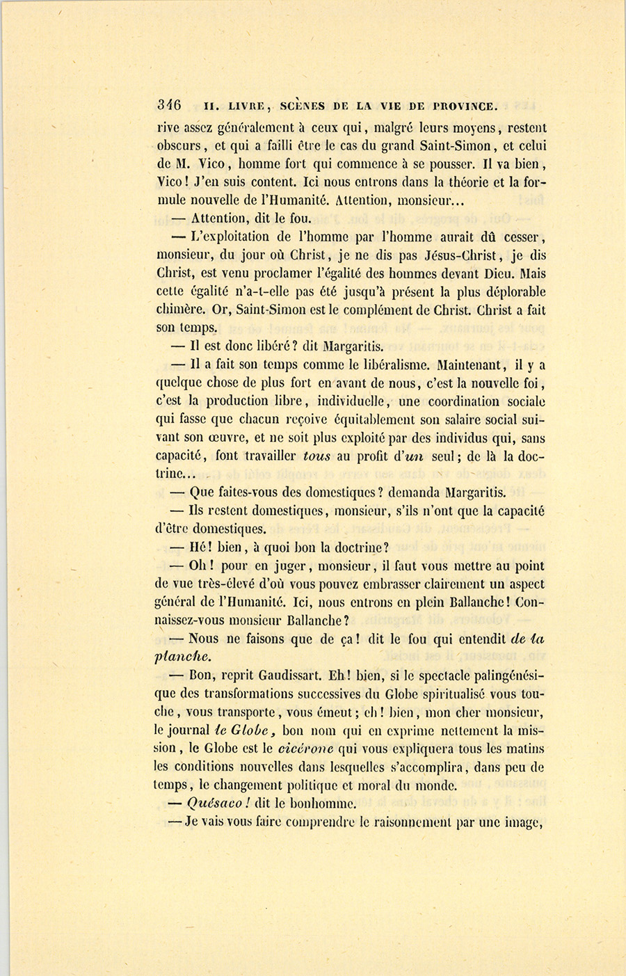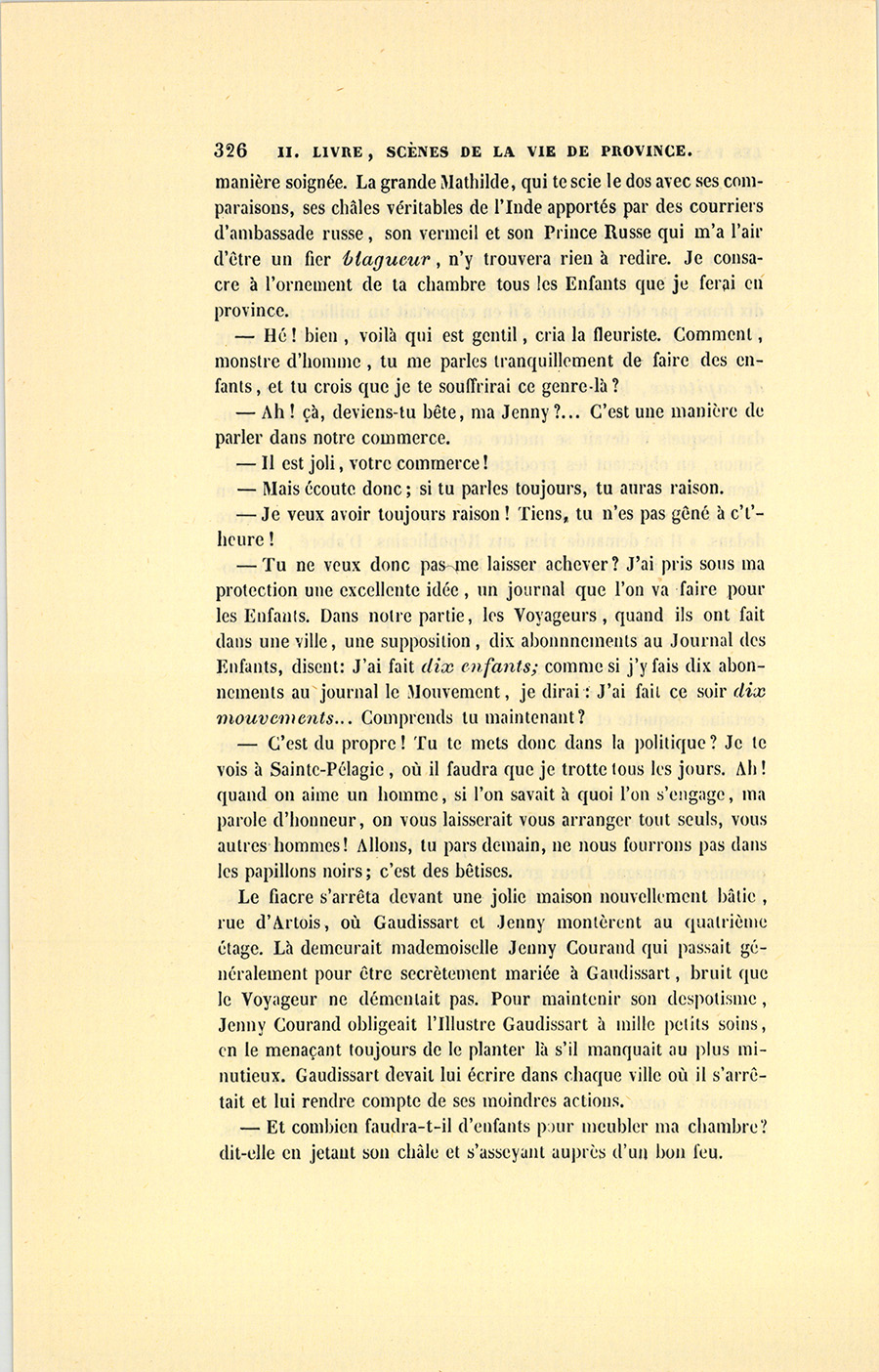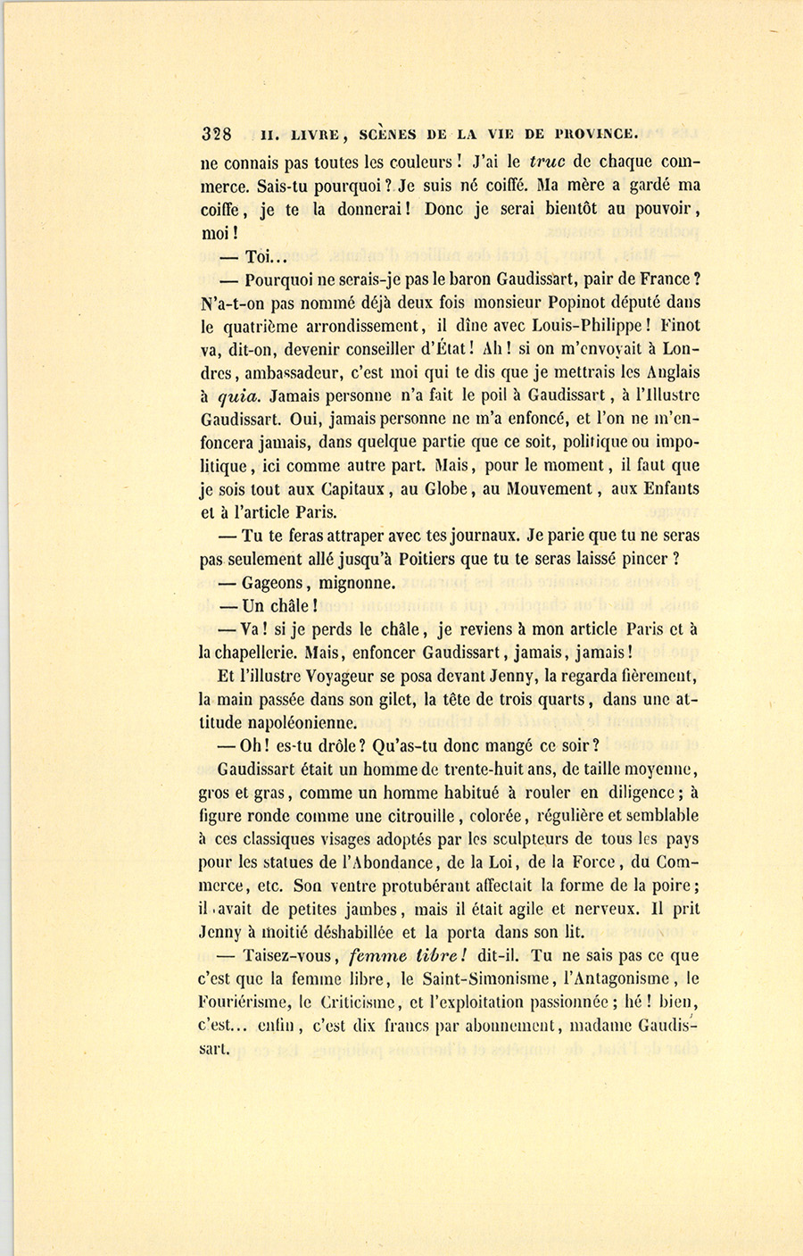 – Taisez-vous, femme libre ! dit-il. Tu ne sais pas ce que c’est que la femme libre, le Saint-Simonisme, l’Antagonisme, le Fouriérisme, le Criticisme, et l’exploitation passionnée ; hé ! bien, c’est… enfin, c’est dix francs par abonnement, madame Gaudissart.