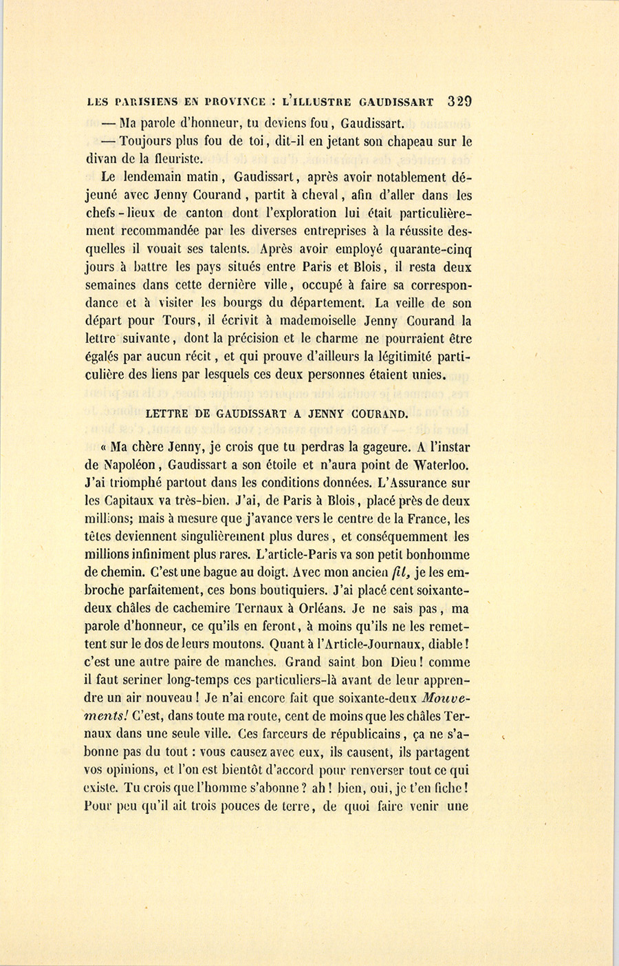 Le lendemain matin, Gaudissart, après avoir notablement déjeuné avec Jenny Courand, partit à cheval, afin d’aller dans les chefs-lieux de canton dont l’exploration lui était particulièrement recommandée par les diverses entreprises à la réussite desquelles il vouait ses talents. Après avoir employé quarante-cinq jours à battre les pays situés entre Paris et Blois, il resta deux semaines dans cette dernière ville, occupé à faire sa correspondance et à visiter les bourgs du département. La veille de son départ pour Tours, il écrivit à mademoiselle Jenny Courand la lettre suivante, dont la précision et le charme ne pourraient être égalés par aucun récit, et qui prouve d’ailleurs la légitimité particulière des liens par lesquels ces deux personnes étaient unies.