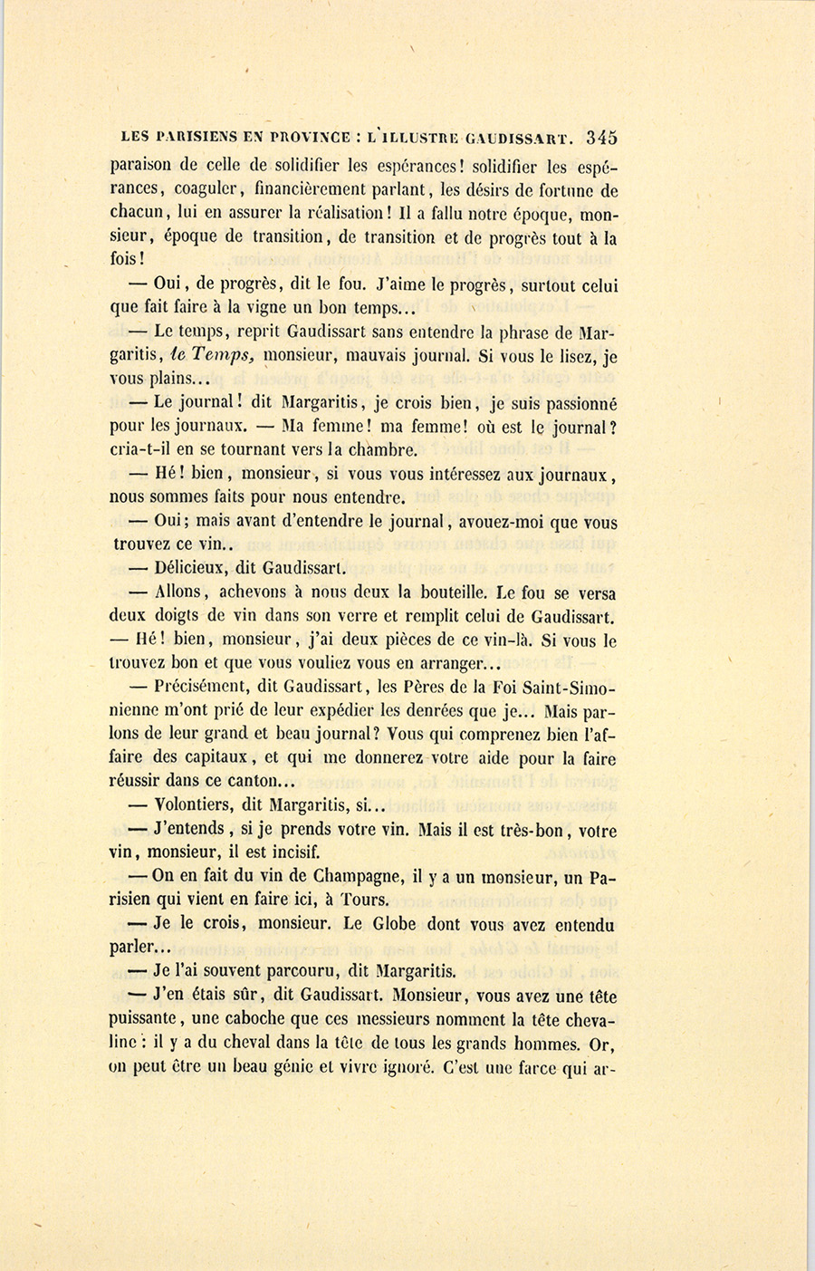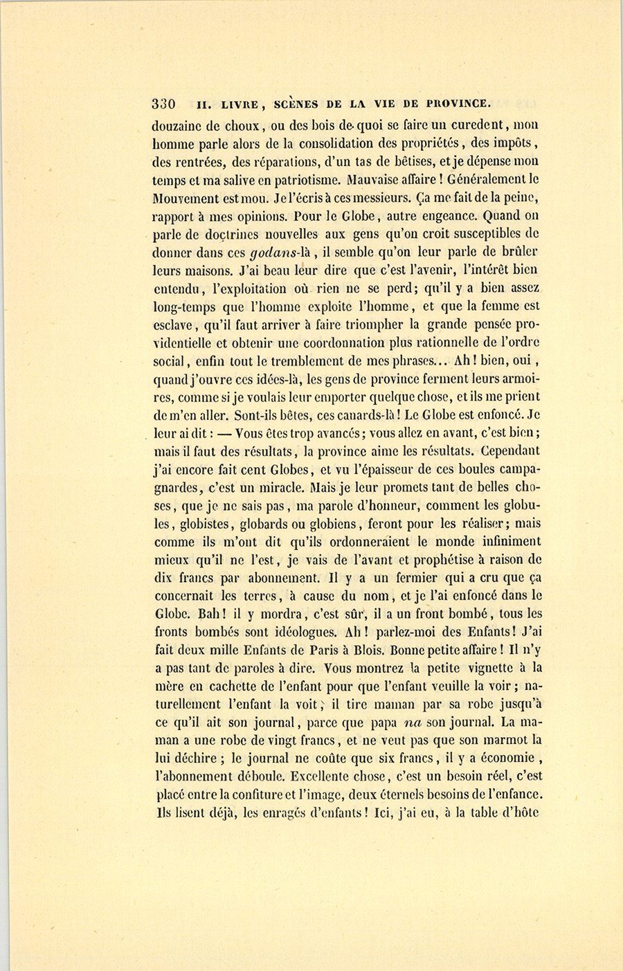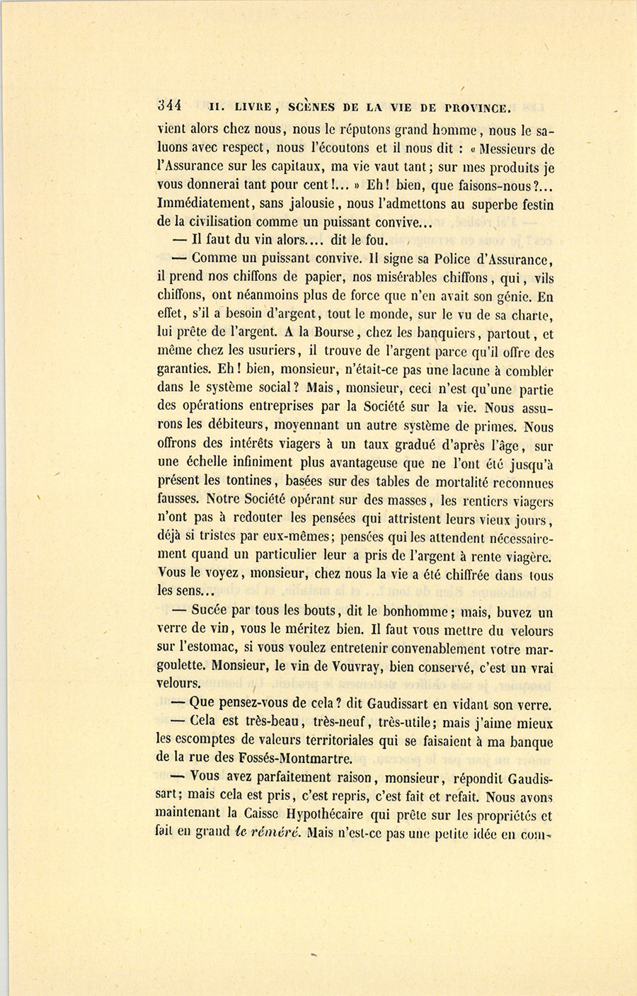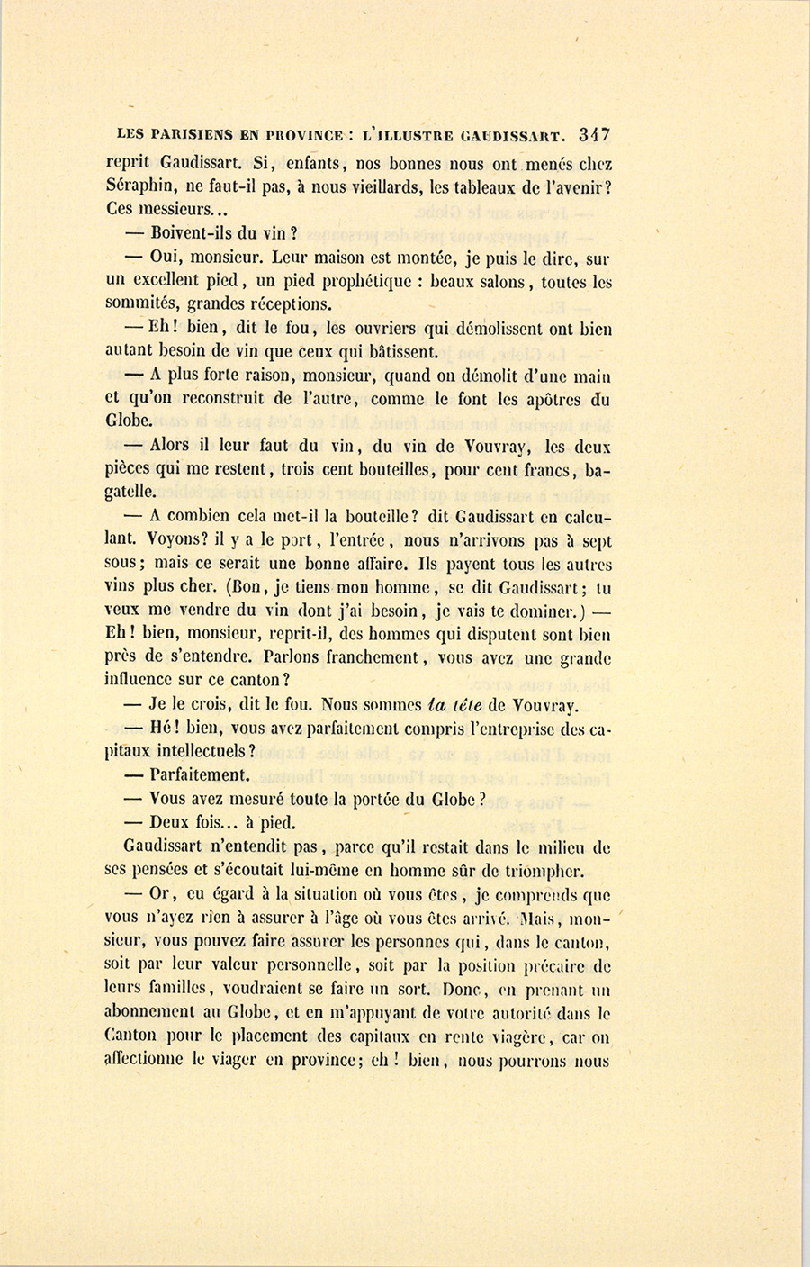 – Or, eu égard à la situation où vous êtes, je comprends que vous n’ayez rien à assurer à l’âge où vous êtes arrivé. Mais, monsieur, vous pouvez faire assurer les personnes qui, dans le canton, soit par leur valeur personnelle, soit par la position précaire de leurs familles, voudraient se faire un sort. Donc, en prenant un abonnement au Globe, et en m’appuyant de votre autorité dans le Canton pour le placement des capitaux en rente viagère, car on affectionne le viager en province ; eh ! bien, nous pourrons nous {p. 348} entendre relativement aux deux pièces de vin. Prenez-vous le Globe ?