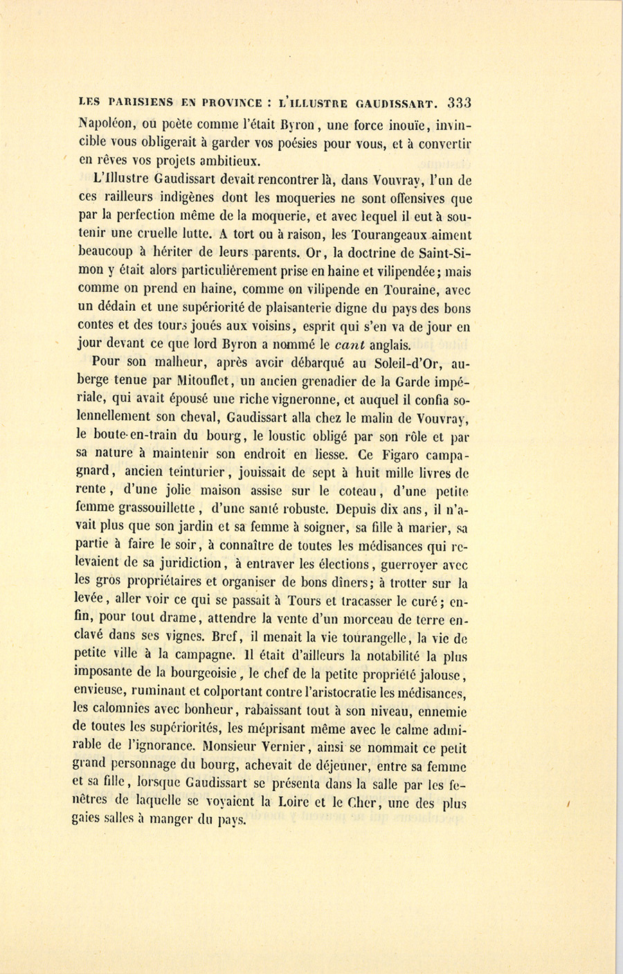L’Illustre Gaudissart devait rencontrer là, dans Vouvray, l’un de ces railleurs indigènes dont les moqueries ne sont offensives que par la perfection même de la moquerie, et avec lequel il eut à soutenir une cruelle lutte. À tort ou à raison, les Tourangeaux aiment beaucoup à hériter de leurs parents. Or, la doctrine de Saint-Simon y était alors particulièrement prise en haine et vilipendée ; mais comme on prend en haine, comme on vilipende en Touraine, avec un dédain et une supériorité de plaisanterie digne du pays des bons contes et des tours joués aux voisins, esprit qui s’en va de jour en jour devant ce que lord Byron a nommé le cant anglais.