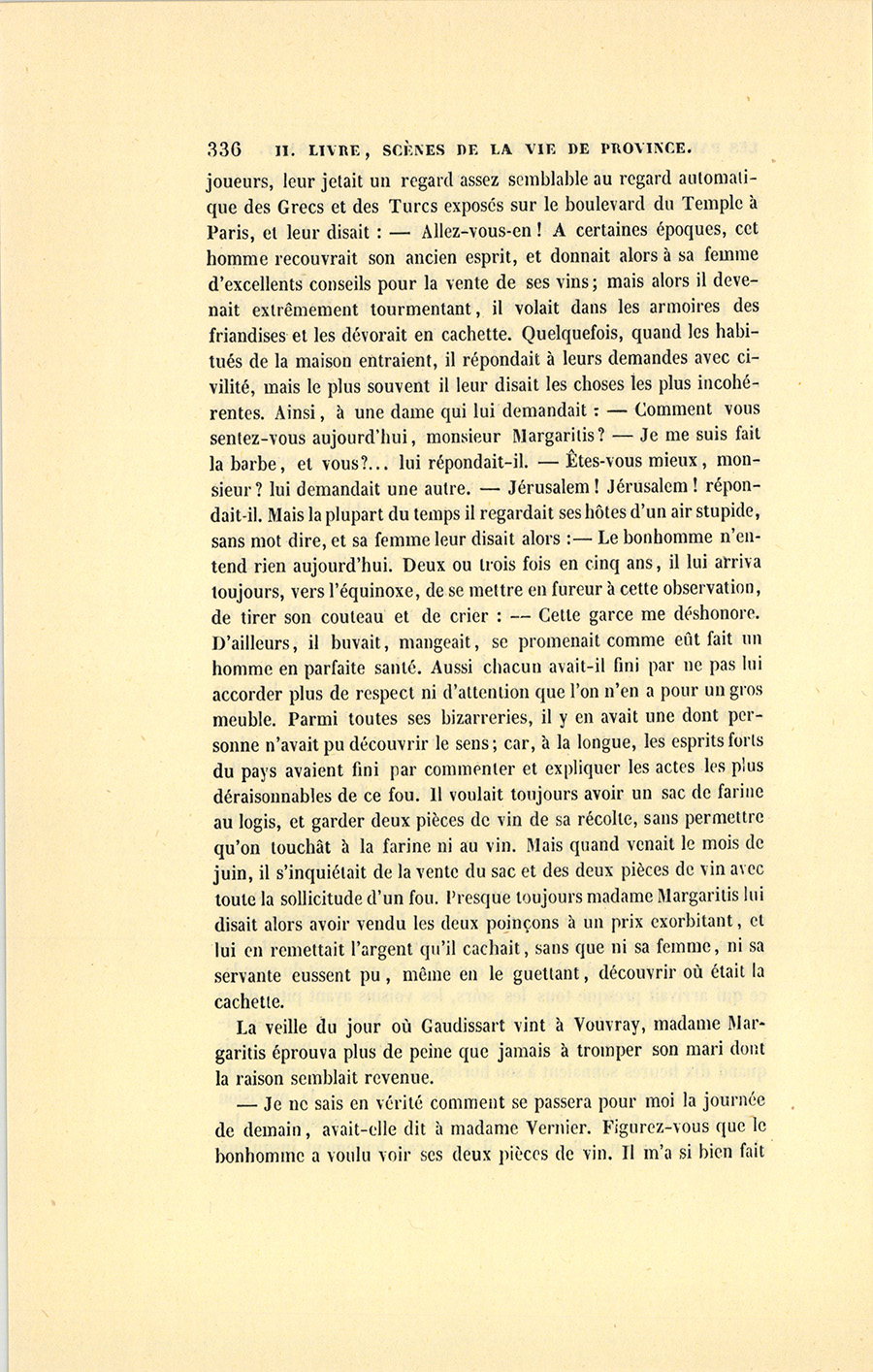 {p. 335} En haut d’une délicieuse vallée, nommée la Vallée Coquette, à cause de ses sinuosités, de ses courbes qui renaissent à chaque pas, et paraissent plus belles à mesure que l’on s’y avance, soit qu’on en monte ou qu’on en descende le joyeux cours, demeurait dans une petite maison entourée d’un clos de vignes, un homme à peu près fou, nommé Margaritis. D’origine italienne, Margaritis était marié, n’avait point d’enfant, et sa femme le soignait avec un courage généralement apprécié. Madame Margaritis courait certainement des dangers près d’un homme qui, entre autres manies, voulait porter sur lui deux couteaux à longue lame, avec lesquels il la menaçait parfois. Mais qui ne connaît l’admirable dévouement avec lequel les gens de province se consacrent aux êtres souffrants, peut-être à cause du déshonneur qui attend une bourgeoise si elle abandonne son enfant ou son mari aux soins publics de l’hôpital ? Puis, qui ne connaît aussi la répugnance qu’ont les gens de province à payer la pension de cent louis ou de mille écus exigée à Charenton, ou par les Maisons de Santé ? Si quelqu’un parlait à madame Margaritis des docteurs Dubuisson, Esquirol, Blanche ou autres, elle préférait avec une noble indignation garder ses trois mille francs en gardant le bonhomme. Les incompréhensibles volontés que dictait la folie à ce bonhomme se trouvant liées au dénoûment de cette aventure, il est nécessaire d’indiquer les plus saillantes. Margaritis sortait aussitôt qu’il pleuvait à verse, et se promenait, la tête nue, dans ses vignes. Au logis, il demandait à tout moment le journal ; pour le contenter, sa femme ou sa servante lui donnaient un vieux journal d’Indre-et-Loire ; et, depuis sept ans, il ne s’était point encore aperçu qu’il lisait toujours le même numéro. Peut-être un médecin n’eût-il pas observé, sans intérêt, le rapport qui existait entre la recrudescence des demandes de journal et les variations atmosphériques. La plus constante occupation de ce fou consistait à vérifier l’état du ciel, relativement à ses effets sur la vigne. Ordinairement, quand sa femme avait du monde, ce qui arrivait presque tous les soirs, les voisins ayant pitié de sa situation, venaient jouer chez elle au boston ; Margaritis restait silencieux, se mettait dans un coin, et n’en bougeait point ; mais quand dix heures sonnaient à son horloge enfermée dans une grande armoire oblongue, il se levait au dernier coup avec la précision mécanique des figures mises en mouvement par un ressort dans les châsses des joujoux8 allemands, il s’avançait lentement jusqu’aux {p. 336} joueurs, leur jetait un regard assez semblable au regard automatique des Grecs et des Turcs exposés sur le boulevard du Temple à Paris, et leur disait : – Allez-vous-en ! À certaines époques, cet homme recouvrait son ancien esprit, et donnait alors à sa femme d’excellents conseils pour la vente de ses vins ; mais alors il devenait extrêmement tourmentant, il volait dans les armoires des friandises et les dévorait en cachette. Quelquefois, quand les habitués de la maison entraient, il répondait à leurs demandes avec civilité, mais le plus souvent il leur disait les choses les plus incohérentes. Ainsi, à une dame qui lui demandait : – Comment vous sentez-vous aujourd’hui, monsieur Margaritis ? – Je me suis fait la barbe, et vous ?… lui répondait-il. – Êtes-vous mieux, monsieur ? lui demandait une autre. – Jérusalem ! Jérusalem ! répondait-il. Mais la plupart du temps il regardait ses hôtes d’un air stupide, sans mot dire, et sa femme leur disait alors : – Le bonhomme n’entend rien aujourd’hui. Deux ou trois fois en cinq ans, il lui arriva toujours, vers l’équinoxe, de se mettre en fureur à cette observation, de tirer son couteau et de crier : – Cette garce me déshonore. D’ailleurs, il buvait, mangeait, se promenait comme eût fait un homme en parfaite santé. Aussi chacun avait-il fini par ne pas lui accorder plus de respect ni d’attention que l’on n’en a pour un gros meuble. Parmi toutes ses bizarreries, il y en avait une dont personne n’avait pu découvrir le sens ; car, à la longue, les esprits forts du pays avaient fini par commenter et expliquer les actes les plus déraisonnables de ce fou. Il voulait toujours avoir un sac de farine au logis, et garder deux pièces de vin de sa récolte, sans permettre qu’on touchât à la farine ni au vin. Mais quand venait le mois de juin, il s’inquiétait de la vente du sac et des deux pièces de vin avec toute la sollicitude d’un fou. Presque toujours madame Margaritis lui disait alors avoir vendu les deux poinçons à un prix exorbitant, et lui en remettait l’argent qu’il cachait, sans que ni sa femme, ni sa servante eussent pu, même en le guettant, découvrir où était la cachette.