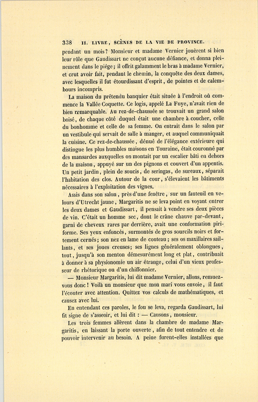 Assis dans son salon, près d’une fenêtre, sur un fauteuil en velours d’Utrecht jaune, Margaritis ne se leva point en voyant entrer les deux dames et Gaudissart, il pensait à vendre ses deux pièces de vin. C’était un homme sec, dont le crâne chauve par-devant, garni de cheveux rares par derrière, avait une conformation piriforme. Ses yeux enfoncés, surmontés de gros sourcils noirs et fortement cernés ; son nez en lame de couteau ; ses os maxillaires saillants, et ses joues creuses ; ses lignes généralement oblongues, tout, jusqu’à son menton démesurément long et plat, contribuait à donner à sa physionomie un air étrange, celui d’un vieux professeur de rhétorique ou d’un chiffonnier.