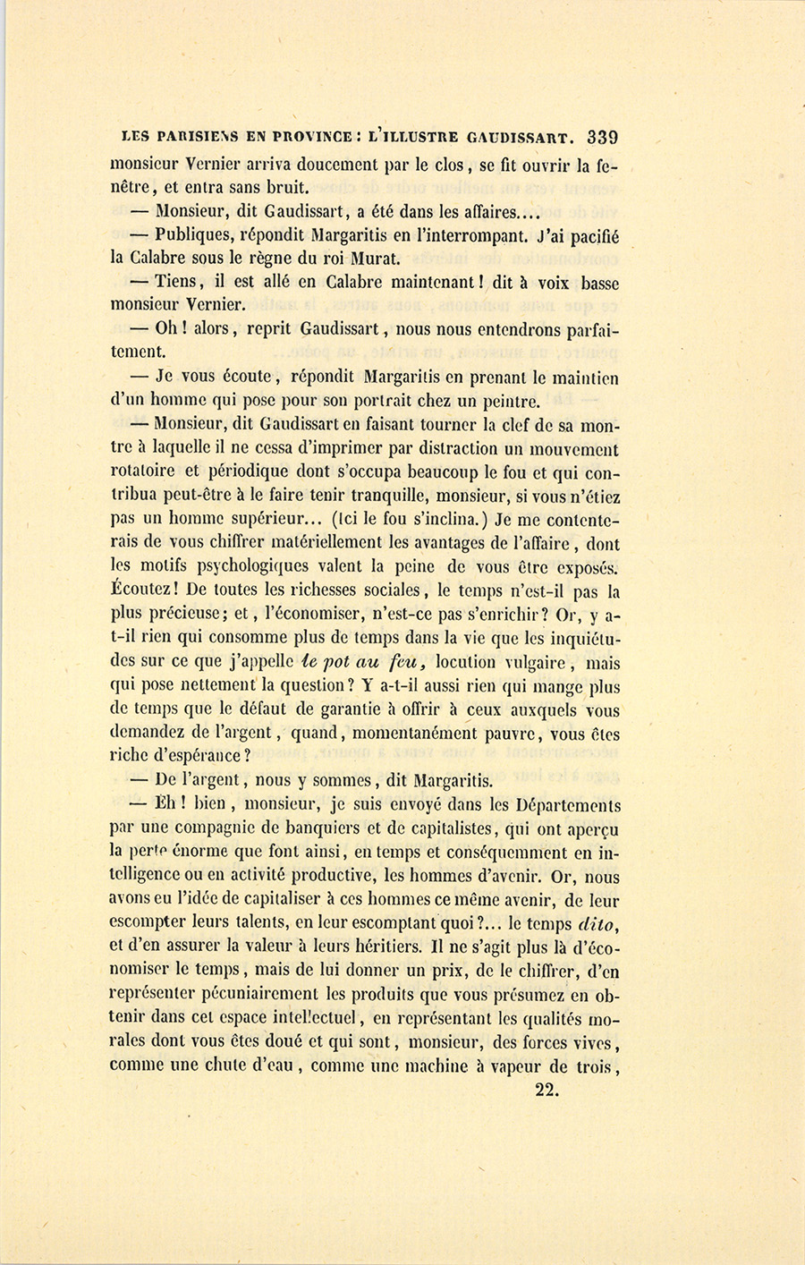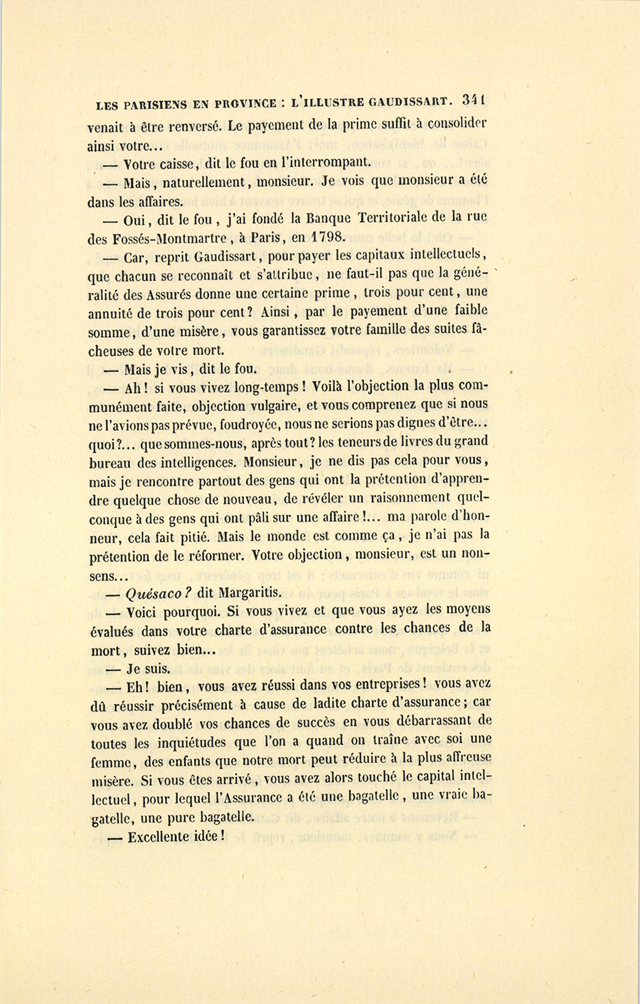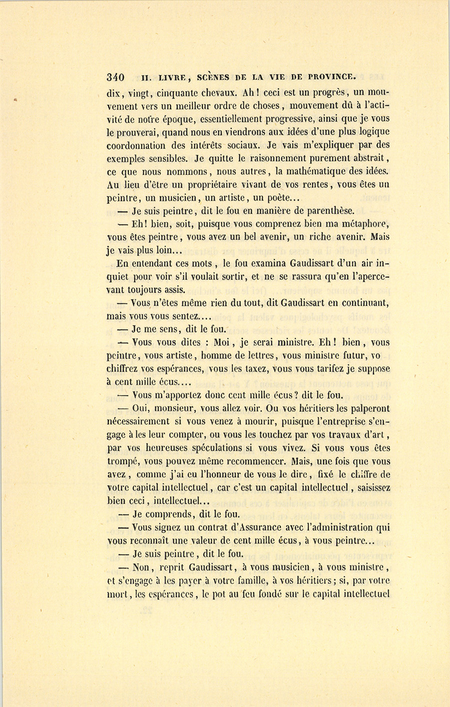 – Eh ! bien, monsieur, je suis envoyé dans les Départements par une compagnie de banquiers et de capitalistes, qui ont aperçu la perte énorme que font ainsi, en temps et conséquemment en intelligence ou en activité productive, les hommes d’avenir. Or, nous avons eu l’idée de capitaliser à ces hommes ce même avenir, de leur escompter leurs talents, en leur escomptant quoi ?… le temps dito, et d’en assurer la valeur à leurs héritiers. Il ne s’agit plus là d’économiser le temps, mais de lui donner un prix, de le chiffrer, d’en représenter pécuniairement les produits que vous présumez en obtenir dans cet espace intellectuel, en représentant les qualités morales dont vous êtes doué et qui sont, monsieur, des forces vives, comme une chute d’eau, comme une machine à vapeur de trois, {p. 340} dix, vingt, cinquante chevaux. Ah ! ceci est un progrès, un mouvement vers un meilleur ordre de choses, mouvement dû à l’activité de notre époque, essentiellement progressive, ainsi que je vous le prouverai, quand nous en viendrons aux idées d’une plus logique coordonnation des intérêts sociaux. Je vais m’expliquer par des exemples sensibles. Je quitte le raisonnement purement abstrait, ce que nous nommons, nous autres, la mathématique des idées. Au lieu d’être un propriétaire vivant de vos rentes, vous êtes un peintre, un musicien, un artiste, un poète…