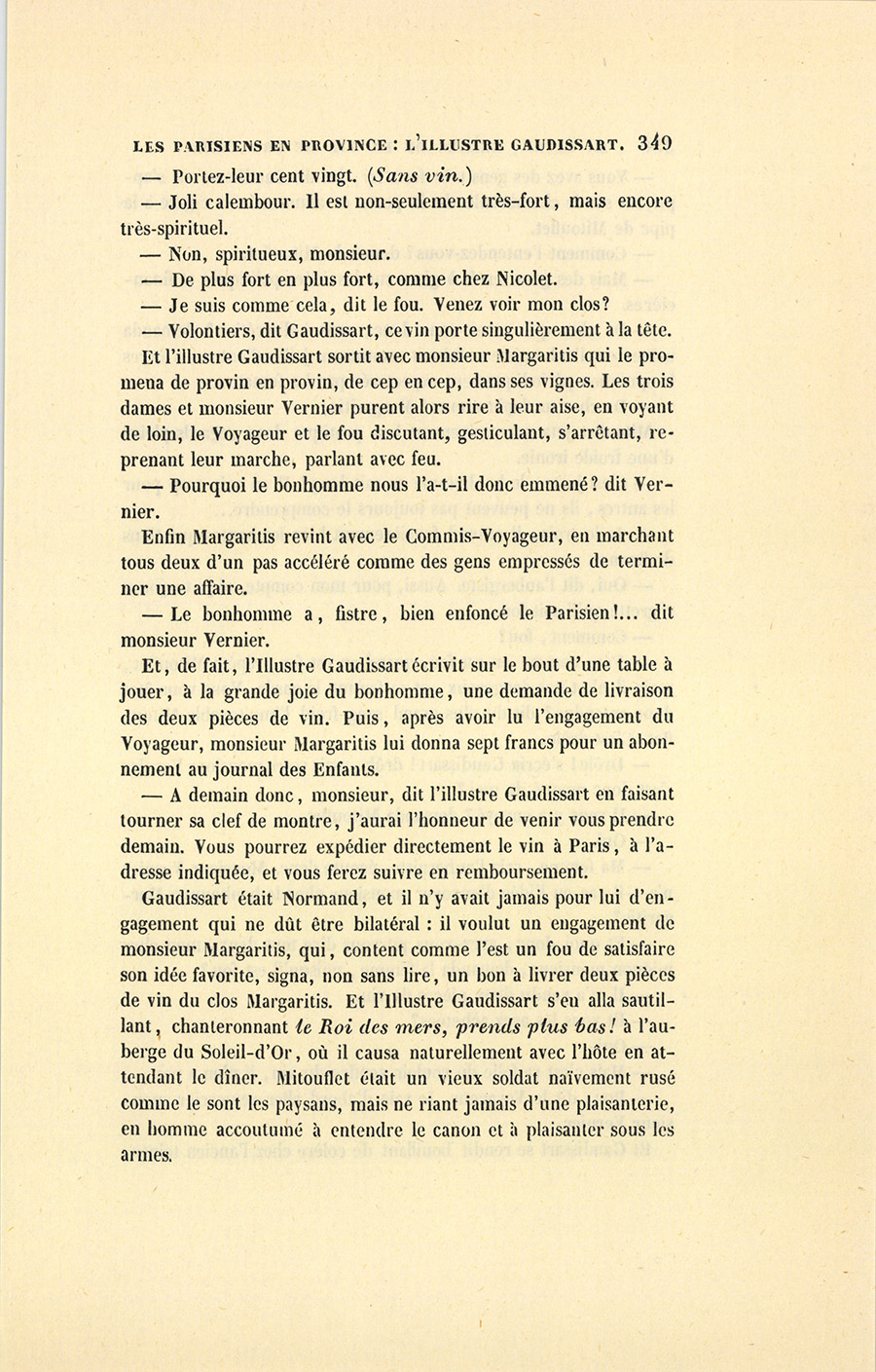 Gaudissart était Normand, et il n’y avait jamais pour lui d’engagement qui ne dût être bilatéral : il voulut un engagement de monsieur Margaritis, qui, content comme l’est un fou de satisfaire son idée favorite, signa, non sans lire, un bon à livrer deux pièces de vin du clos Margaritis. Et l’Illustre Gaudissart s’en alla sautillant, chanteronnant le Roi des mers, prends plus bas ! à l’auberge du Soleil-d’Or, où il causa naturellement avec l’hôte en attendant le dîner. Mitouflet était un vieux soldat naïvement rusé comme le sont les paysans, mais ne riant jamais d’une plaisanterie, en homme accoutumé à entendre le canon et à plaisanter sous les armes.