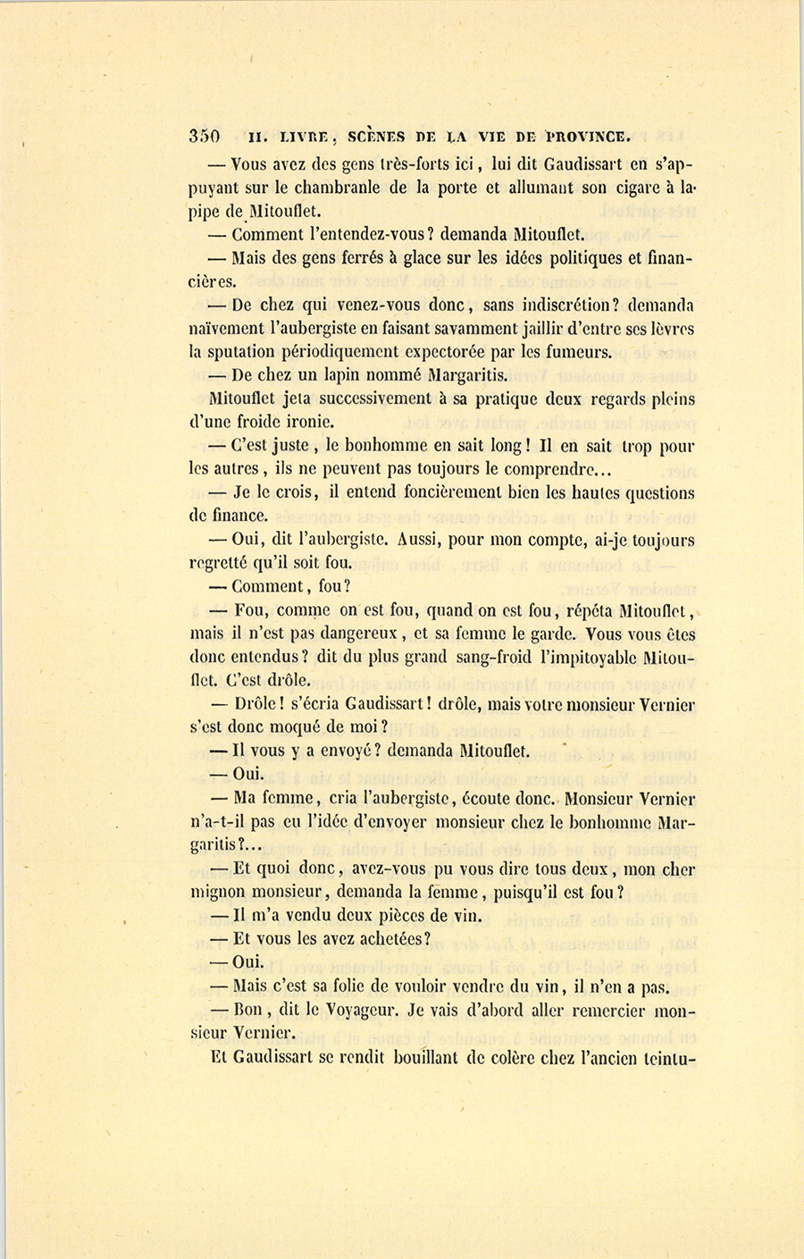 {p. 350} – Vous avez des gens très-forts ici, lui dit Gaudissart en s’appuyant sur le chambranle de la porte et allumant son cigare à la pipe de Mitouflet.