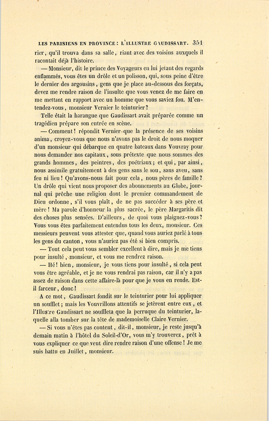 – Si vous n’êtes pas content, dit-il, monsieur, je reste jusqu’à demain matin à l’hôtel du Soleil-d’Or, vous m’y trouverez, prêt à vous expliquer ce que veut dire rendre raison d’une offense ! Je me suis battu en Juillet, monsieur.