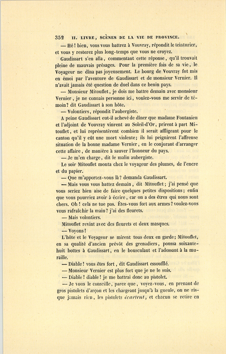 Gaudissart s’en alla, commentant cette réponse, qu’il trouvait pleine de mauvais présages. Pour la première fois de sa vie, le Voyageur ne dîna pas joyeusement. Le bourg de Vouvray fut mis en émoi par l’aventure de Gaudissart et de monsieur Vernier. Il n’avait jamais été question de duel dans ce benin pays.
