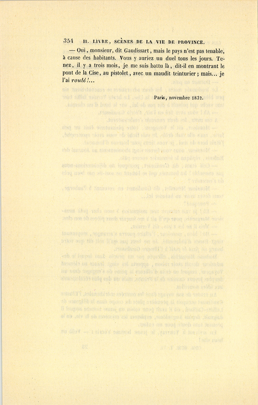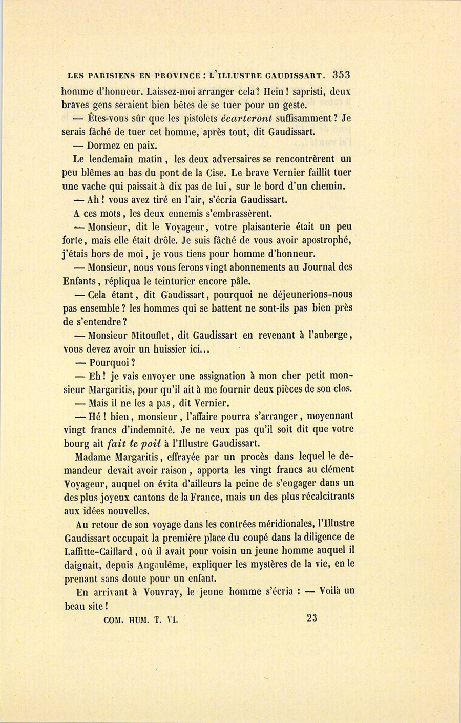 {p. 354} – Oui, monsieur, dit Gaudissart, mais le pays n’est pas tenable, à cause des habitants. Vous y auriez un duel tous les jours. Tenez, il y a trois mois, je me suis battu là, dit-il en montrant le pont de la Cise, au pistolet, avec un maudit teinturier ; mais… je l’ai roulé !…