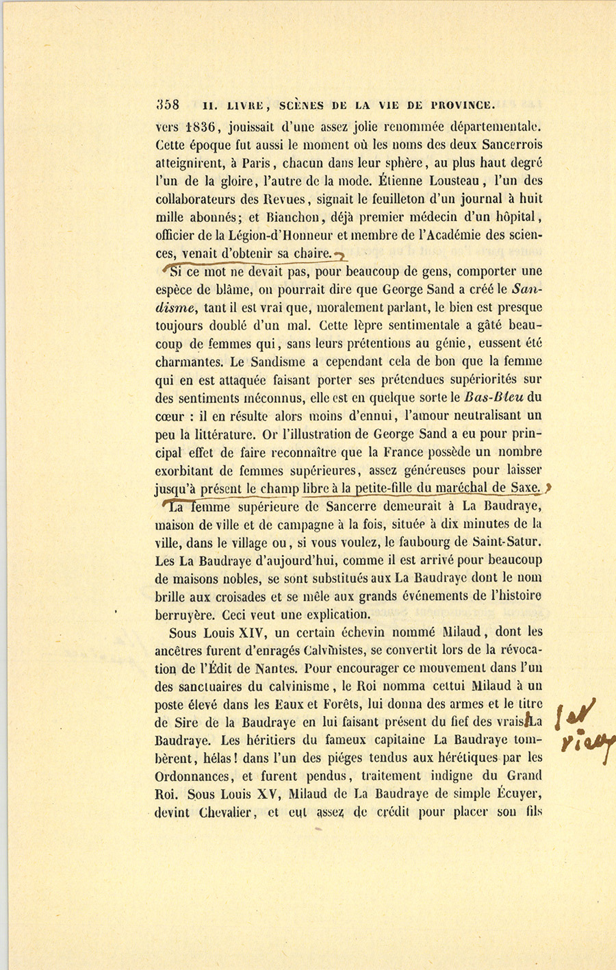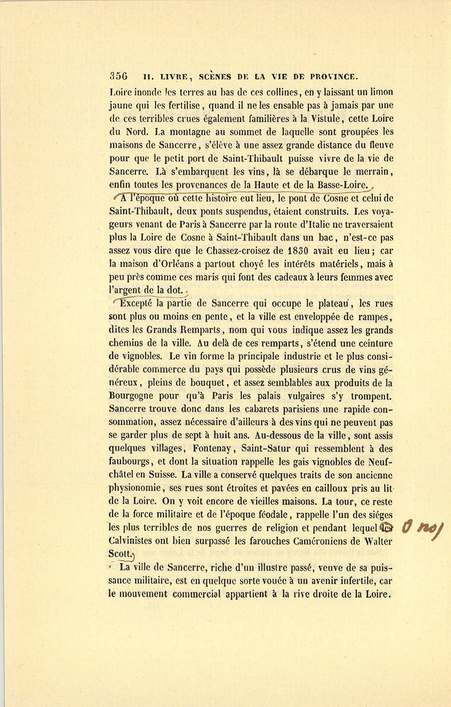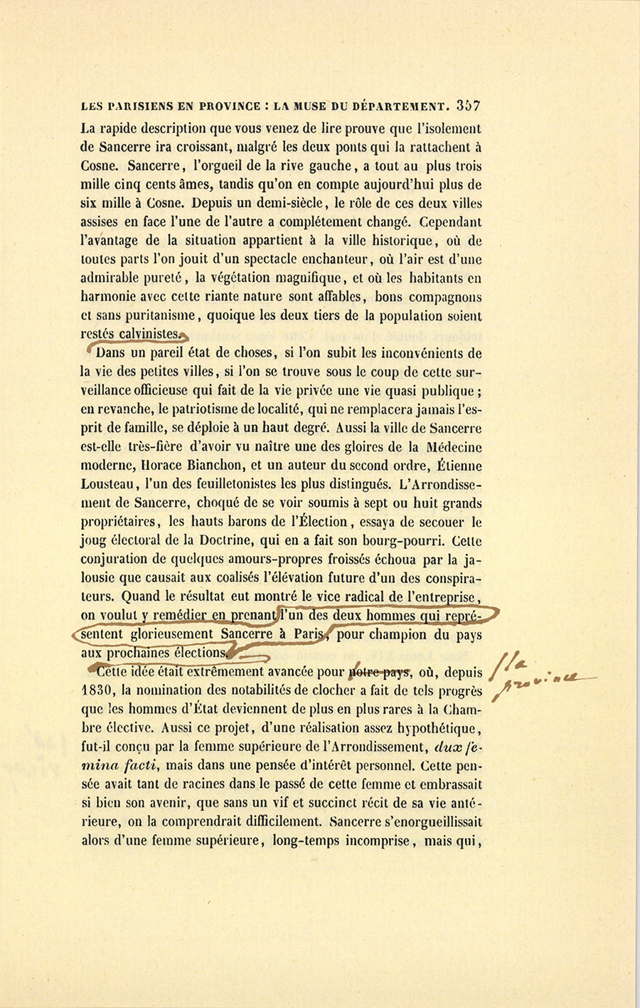 Sur la lisière du Berry se trouve au bord de la Loire une ville qui par sa situation attire infailliblement l’œil du voyageur. Sancerre occupe le point culminant d’une chaîne de petites montagnes, dernière ondulation des mouvements de terrain du Nivernais. La {p. 356} Loire inonde les terres au bas de ces collines, en y laissant un limon jaune qui les fertilise, quand il ne les ensable pas à jamais par une de ces terribles crues également familières à la Vistule, cette Loire du Nord. La montagne au sommet de laquelle sont groupées les maisons de Sancerre, s’élève à une assez grande distance du fleuve pour que le petit port de Saint-Thibault puisse vivre de la vie de Sancerre. Là s’embarquent les vins, là se débarque le merrain, enfin toutes les provenances de la Haute et de la Basse-Loire. À l’époque où cette histoire eut lieu, le pont de Cosne et celui de Saint-Thibault, deux ponts suspendus, étaient construits. Les voyageurs venant de Paris à Sancerre par la route d’Italie ne traversaient plus la Loire de Cosne à Saint-Thibault dans un bac, n’est-ce pas assez vous dire que le Chassez-croisez de 1830 avait eu lieu ; car la maison d’Orléans a partout choyé les intérêts matériels, mais à peu près comme ces maris qui font des cadeaux à leurs femmes avec l’argent de la dot. Excepté la partie de Sancerre qui occupe le plateau, les rues sont plus ou moins en pente, et la ville est enveloppée de rampes, dites les Grands Remparts, nom qui vous indique assez les grands chemins de la ville. Au delà de ces remparts, s’étend une ceinture de vignobles. Le vin forme la principale industrie et le plus considérable commerce du pays qui possède plusieurs crus de vins généreux, pleins de bouquet, et assez semblables aux produits de la Bourgogne pour qu’à Paris les palais vulgaires s’y trompent. Sancerre trouve donc dans les cabarets parisiens une rapide consommation, assez nécessaire d’ailleurs à des vins qui ne peuvent pas se garder plus de sept à huit ans. Au-dessous de la ville, sont assis quelques villages, Fontenay, Saint-Satur qui ressemblent à des faubourgs, et dont la situation rappelle les gais vignobles de Neufchâtel en Suisse. La ville a conservé quelques traits de son ancienne physionomie, ses rues sont étroites et pavées en cailloux pris au lit de la Loire. On y voit encore de vieilles maisons. La tour, ce reste de la force militaire et de l’époque féodale, rappelle l’un des siéges les plus terribles de nos guerres de religion et pendant lequel nos Calvinistes ont bien surpassé les farouches Caméroniens de Walter Scott. La ville de Sancerre, riche d’un illustre passé, veuve de sa puissance militaire, est en quelque sorte vouée à un avenir infertile, car le mouvement commercial appartient à la rive droite de la Loire. {p. 357} La rapide description que vous venez de lire prouve que l’isolement de Sancerre ira croissant, malgré les deux ponts qui la rattachent à Cosne. Sancerre, l’orgueil de la rive gauche, a tout au plus trois mille cinq cents âmes, tandis qu’on en compte aujourd’hui plus de six mille à Cosne. Depuis un demi-siècle, le rôle de ces deux villes assises en face l’une de l’autre a complétement changé. Cependant l’avantage de la situation appartient à la ville historique, où de toutes parts l’on jouit d’un spectacle enchanteur, où l’air est d’une admirable pureté, la végétation magnifique, et où les habitants en harmonie avec cette riante nature sont affables, bons compagnons et sans puritanisme, quoique les deux tiers de la population soient restés calvinistes. Dans un pareil état de choses, si l’on subit les inconvénients de la vie des petites villes, si l’on se trouve sous le coup de cette surveillance officieuse qui fait de la vie privée une vie quasi publique ; en revanche, le patriotisme de localité, qui ne remplacera jamais l’esprit de famille, se déploie à un haut degré. Aussi la ville de Sancerre est-elle très-fière d’avoir vu naître une des gloires de la Médecine moderne, Horace Bianchon, et un auteur du second ordre, Étienne Lousteau, l’un des feuilletonistes les plus distingués. L’Arrondissement de Sancerre, choqué de se voir soumis à sept ou huit grands propriétaires, les hauts barons de l’Élection, essaya de secouer le joug électoral de la Doctrine, qui en a fait son bourg-pourri. Cette conjuration de quelques amours-propres froissés échoua par la jalousie que causait aux coalisés l’élévation future d’un des conspirateurs. Quand le résultat eut montré le vice radical de l’entreprise, on voulut y remédier en prenant pour champion du pays aux prochaines élections l’un des deux hommes qui représentent glorieusement Sancerre à Paris. Cette idée était extrêmement avancée pour la province, où, depuis 1830, la nomination des notabilités de clocher a fait de tels progrès que les hommes d’État deviennent de plus en plus rares à la Chambre élective. Aussi ce projet, d’une réalisation assez hypothétique, fut-il conçu par la femme supérieure de l’Arrondissement, dux femina facti, mais dans une pensée d’intérêt personnel. Cette pensée avait tant de racines dans le passé de cette femme et embrassait si bien son avenir, que sans un vif et succinct récit de sa vie antérieure, on la comprendrait difficilement. Sancerre s’enorgueillissait alors d’une femme supérieure, long-temps incomprise, mais qui, {p. 358} vers 1836, jouissait d’une assez jolie renommée départementale. Cette époque fut aussi le moment où les noms des deux Sancerrois atteignirent, à Paris, chacun dans leur sphère, au plus haut degré l’un de la gloire, l’autre de la mode. Étienne Lousteau, l’un des collaborateurs des Revues, signait le feuilleton d’un journal à huit mille abonnés ; et Bianchon, déjà premier médecin d’un hôpital, officier de la Légion-d’Honneur et membre de l’Acad