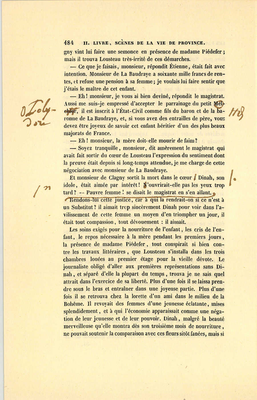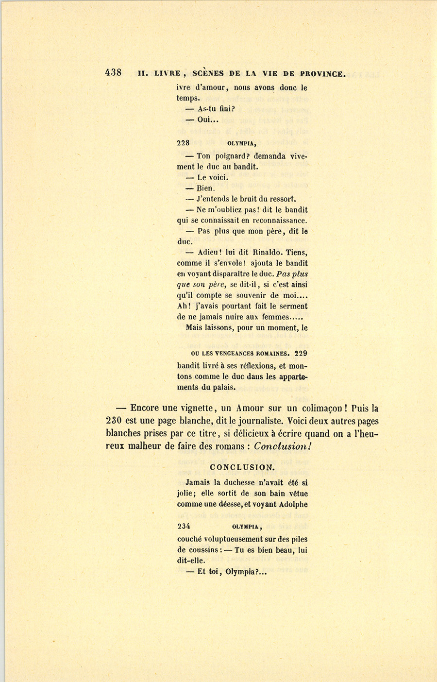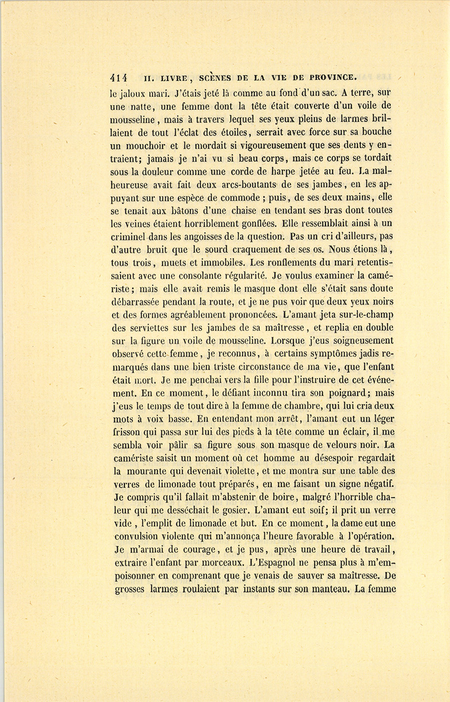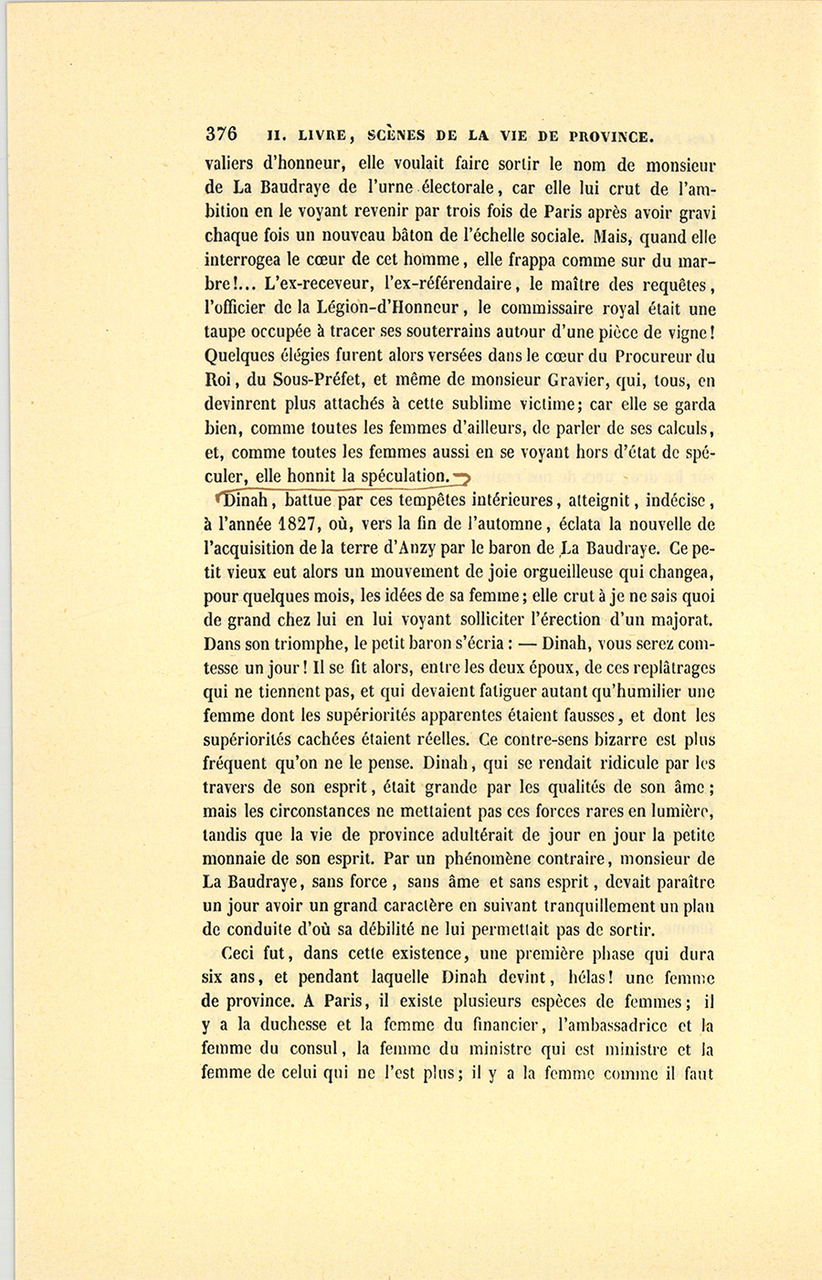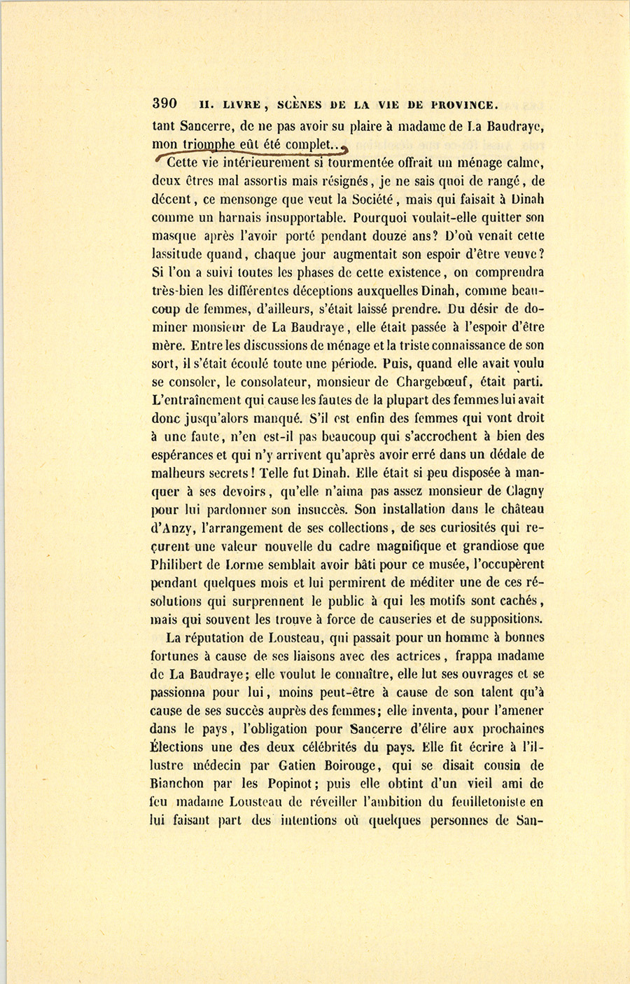 Il se jouait, en effet, dans le ménage de madame de La Baudraye une tragi-comédie en harmonie avec ses luttes relativement à la fortune, avec ses transformations successives, et dont, après l’abbé {p. 382} Duret, monsieur de Clagny seul eut connaissance, lorsque Dinah, par désœuvrement, par vanité peut être, lui livra le secret de sa gloire anonyme.
