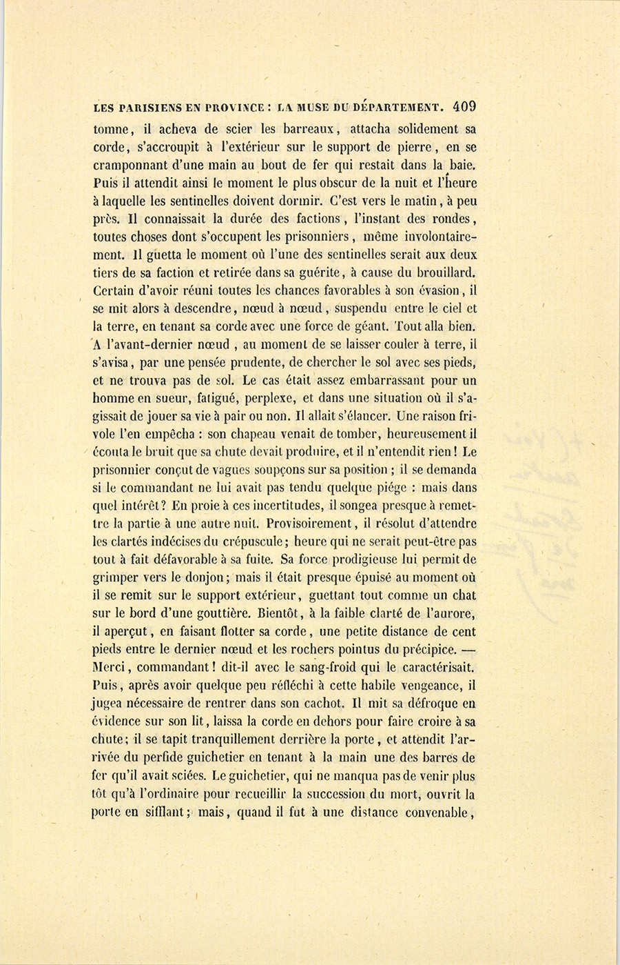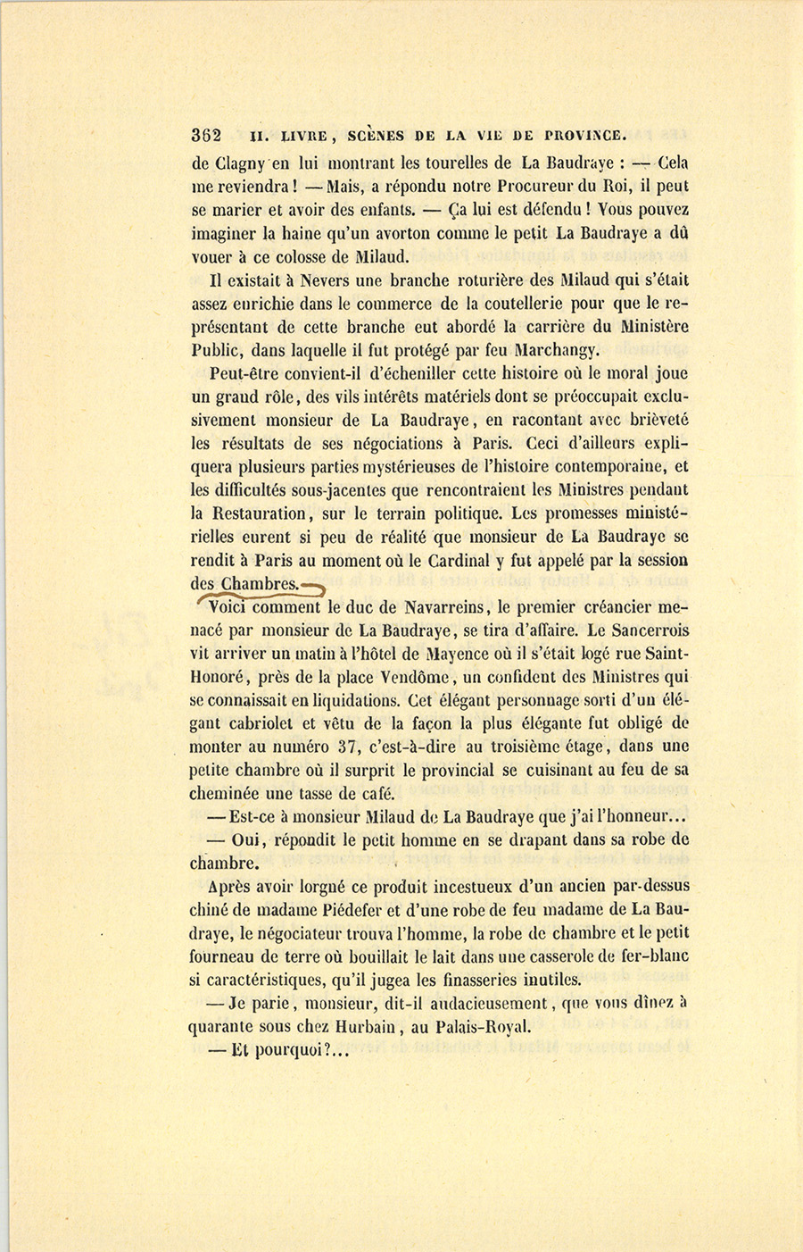 Peut-être convient-il d’écheniller cette histoire où le moral joue un grand rôle, des vils intérêts matériels dont se préoccupait exclusivement monsieur de La Baudraye, en racontant avec brièveté les résultats de ses négociations à Paris. Ceci d’ailleurs expliquera plusieurs parties mystérieuses de l’histoire contemporaine, et les difficultés sous-jacentes que rencontraient les Ministres pendant la Restauration, sur le terrain politique. Les promesses ministérielles eurent si peu de réalité que monsieur de La Baudraye se rendit à Paris au moment où le Cardinal y fut appelé par la session des Chambres. Voici comment le duc de Navarreins, le premier créancier menacé par monsieur de La Baudraye, se tira d’affaire. Le Sancerrois vit arriver un matin à l’hôtel de Mayence où il s’était logé rue Saint-Honoré, près de la place Vendôme, un confident des Ministres qui se connaissait en liquidations. Cet élégant personnage sorti d’un élégant cabriolet et vêtu de la façon la plus élégante fut obligé de monter au numéro 37, c’est-à-dire au troisième étage, dans une petite chambre où il surprit le provincial se cuisinant au feu de sa cheminée une tasse de café.