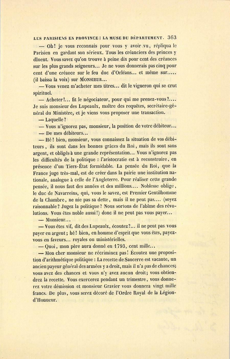 – Vous êtes vif, dit des Lupeaulx, écoutez ?… il ne peut pas vous payer en argent ; hé ! bien, en homme d’esprit que vous êtes, payez-vous en faveurs… royales ou ministérielles.
