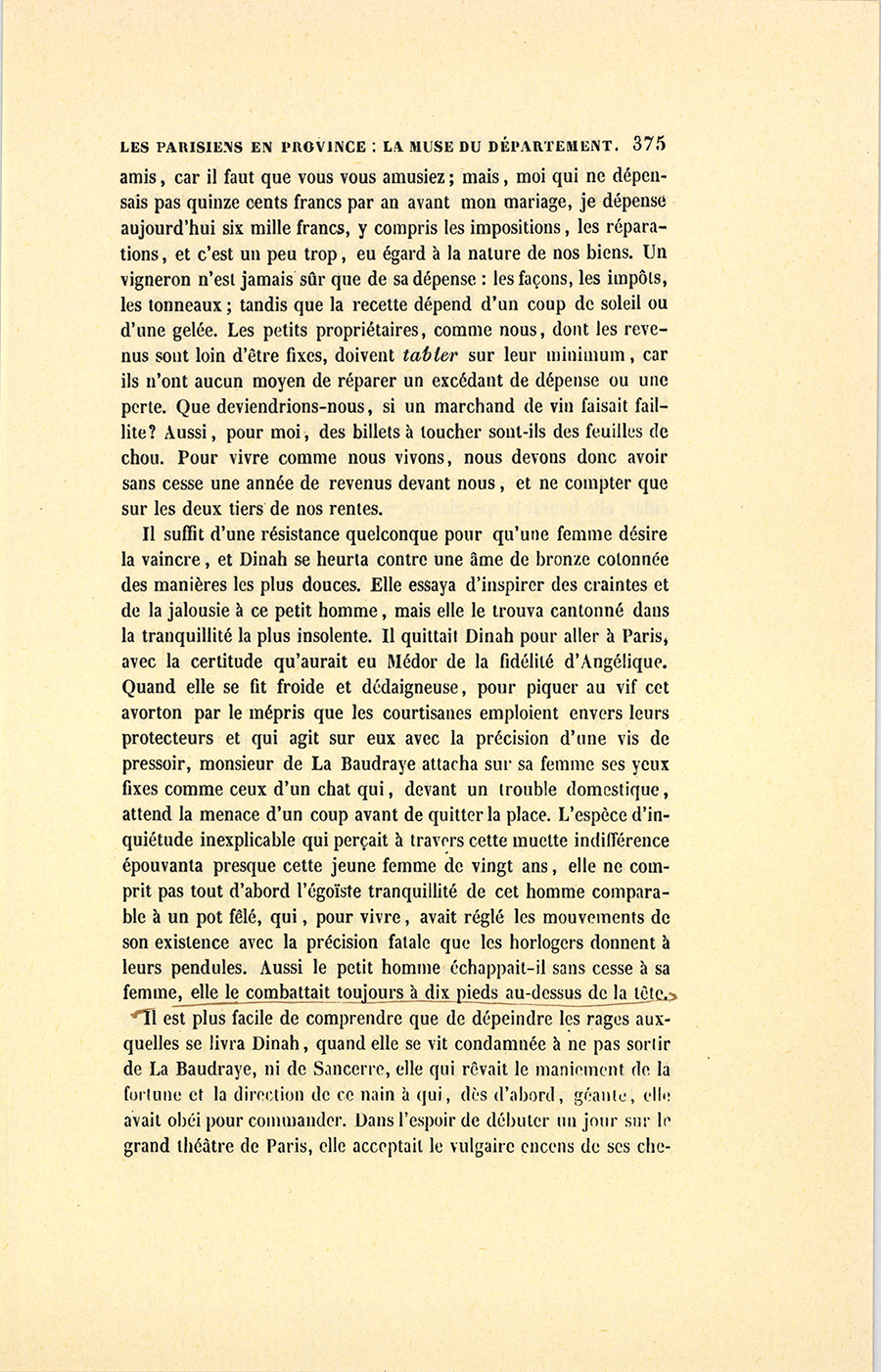 Une jeune fille dont les succès au pensionnat Chamarolles avaient eu l’orgueil pour ressort, dont le premier calcul avait été récompensé par une première victoire, ne devait pas s’arrêter en si beau chemin. Quelque chétif que parût être monsieur de La Baudraye, il fut, pour mademoiselle Dinah Piédefer, un parti vraiment inespéré. Quelle pouvait être l’arrière-pensée de ce vigneron, en se mariant à quarante-quatre ans avec une jeune fille de dix-sept ans, et quel parti sa femme pouvait-elle tirer de lui ? Tel fut le premier texte des méditations de Dinah. Le petit homme trompa perpétuellement l’observation de sa femme. Ainsi, tout d’abord, il laissa prendre les deux précieux hectares perdus en agrément autour de La Baudraye, et il donna presque généreusement les sept à huit mille francs nécessaires aux arrangements intérieurs dirigés par Dinah qui put acheter à Issoudun le mobilier Rouget, et entreprendre chez elle le système de ses décorations Moyen-Âge, Louis XIV et Pompadour. La jeune mariée eut alors peine à croire que monsieur de La Baudraye fût avare, comme on le lui disait, ou elle put penser avoir conquis un peu d’ascendant sur lui. Cette erreur dura dix-huit mois. Après le second voyage de monsieur de La Baudraye à Paris, Dinah reconnut chez lui la froideur polaire des avares de province en tout ce qui concernait l’argent. À la première demande de capitaux, elle joua la plus gracieuse de ces comédies dont le secret vient d’Ève ; mais le petit homme expliqua nettement à sa femme qu’il lui donnait deux cents francs par mois pour sa dépense personnelle, qu’il servait douze cents francs de rente viagère à madame Piédefer pour le domaine de La Hautoy, qu’ainsi les mille écus de la dot étaient dépassés d’une somme de deux cents francs par an. – Je ne vous parle pas des dépenses de notre maison, dit-il en terminant, je vous laisse offrir des brioches et du thé le soir à vos {p. 375} amis, car il faut que vous vous amusiez ; mais, moi qui ne dépensais pas quinze cents francs par an avant mon mariage, je dépense aujourd’hui six mille francs, y compris les impositions, les réparations, et c’est un peu trop, eu égard à la nature de nos biens. Un vigneron n’est jamais sûr que de sa dépense : les façons, les impôts, les tonneaux ; tandis que la recette dépend d’un coup de soleil ou d’une gelée. Les petits propriétaires, comme nous, dont les revenus sont loin d’être fixes, doivent tabler sur leur minimum, car ils n’ont aucun moyen de réparer un excédent8 de dépense ou une perte. Que deviendrions-nous, si un marchand de vin faisait faillite ? Aussi, pour moi, des billets à toucher sont-ils des feuilles de chou. Pour vivre comme nous vivons, nous devons donc avoir sans cesse une année de revenus devant nous, et ne compter que sur les deux tiers de nos rentes.