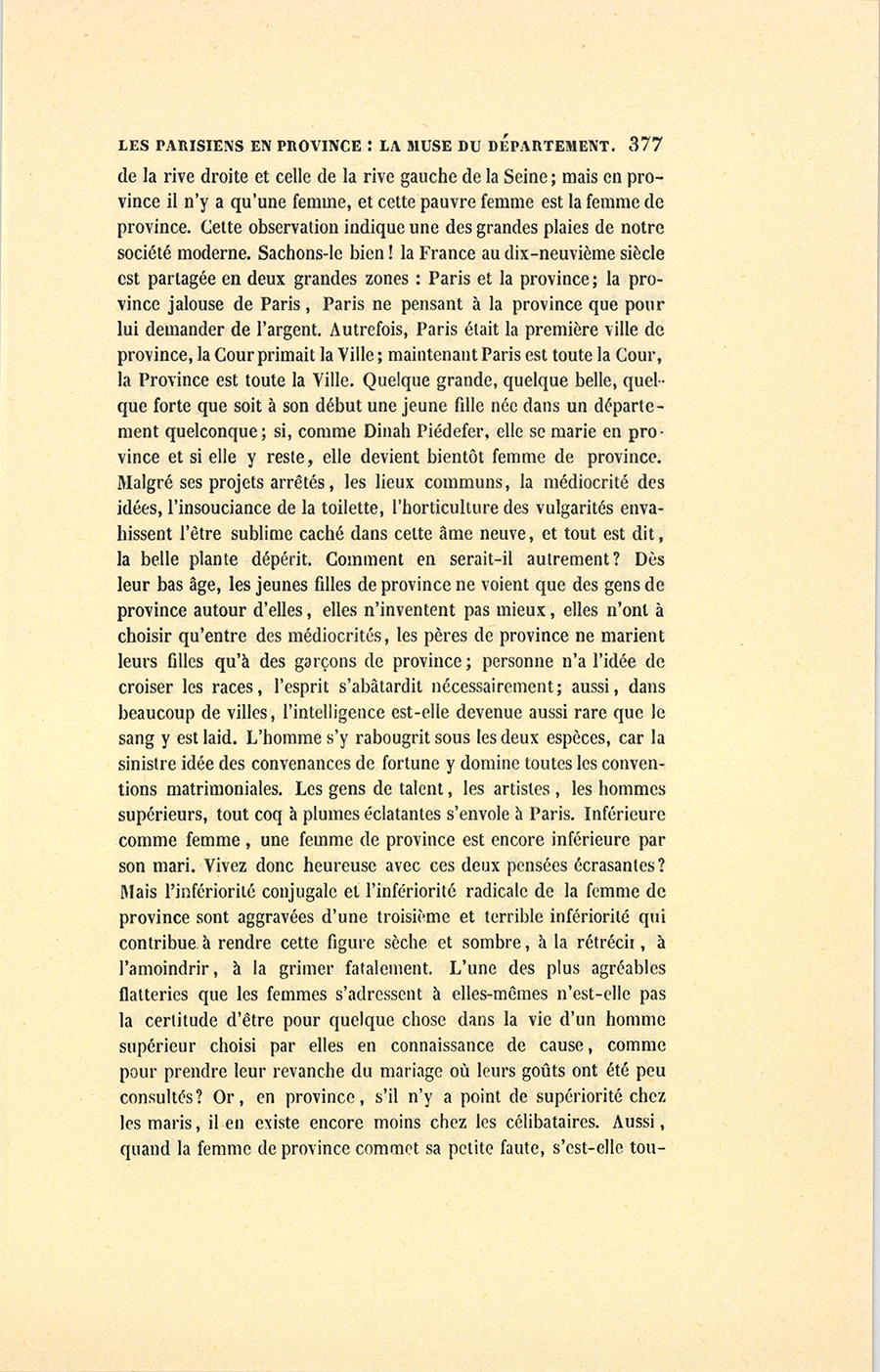 – Paris est le monstre qui fait nos chagrins, répondit la femme supérieure. Le mal a sept lieues de tour et afflige le pays tout entier. La province n’existe pas par elle-même. Là seulement où la nation est divisée en cinquante petits États, là chacun peut avoir une physionomie, et une femme reflète alors l’éclat de la sphère où elle règne. Ce phénomène social se voit encore, m’a-t-on dit, en Italie, en Suisse et en Allemagne ; mais en France, comme dans tous les pays à capitale unique, l’aplatissement des mœurs sera la conséquence forcée de la centralisation.