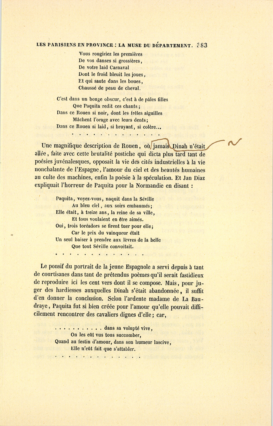 Le ponsif du portrait de la jeune Espagnole a servi depuis à tant de courtisanes dans tant de prétendus poèmes qu’il serait fastidieux de reproduire ici les cent vers dont il se compose. Mais, pour juger des hardiesses auxquelles Dinah s’était abandonnée, il suffit d’en donner la conclusion. Selon l’ardente madame de La Baudraye, Paquita fut si bien créée pour l’amour qu’elle pouvait difficilement rencontrer des cavaliers dignes d’elle ; car,