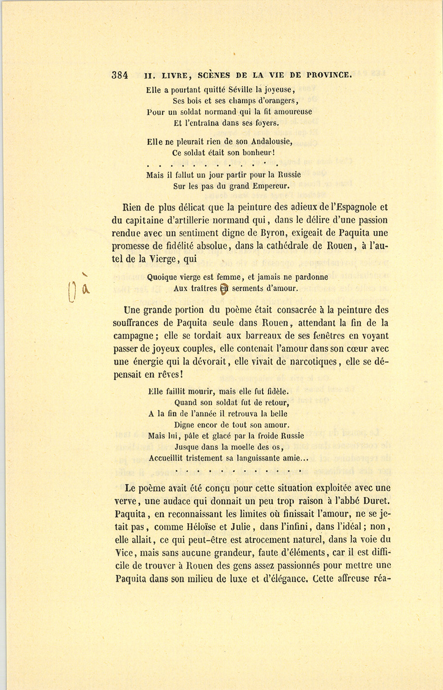 Quoique l’alliance des vers et de la prose soit vraiment monstrueuse dans la littérature française, il est néanmoins des exceptions à cette règle. Cette histoire offrira donc une des deux violations qui, dans ces Études, seront commises envers la charte du Conte ; car, pour faire entrevoir les luttes intimes qui peuvent excuser Dinah sans l’absoudre, il est nécessaire d’analyser un poème, le fruit de son profond désespoir.