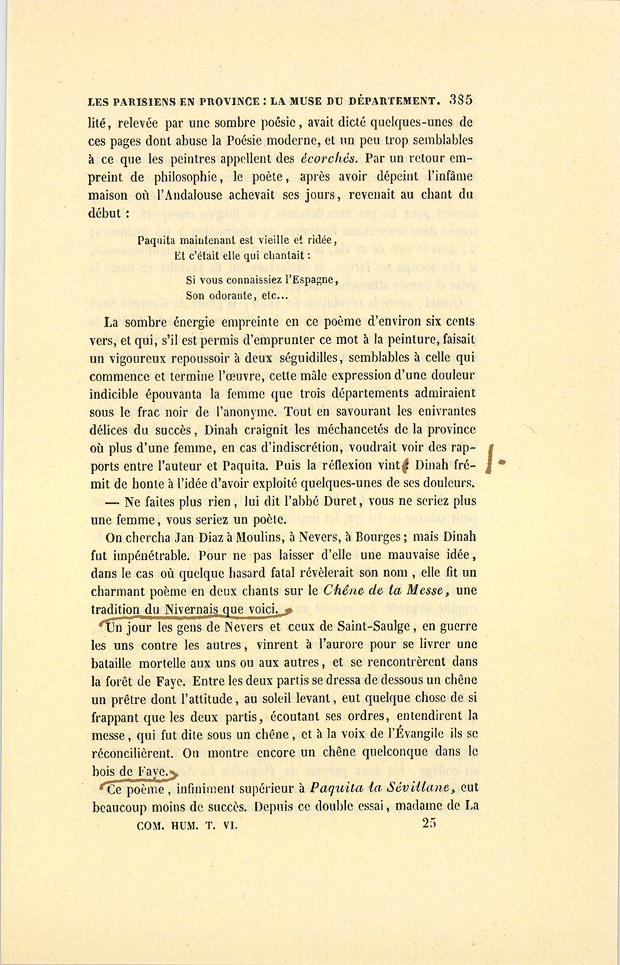 On chercha Jan Diaz à Moulins, à Nevers, à Bourges ; mais Dinah fut impénétrable. Pour ne pas laisser d’elle une mauvaise idée, dans le cas où quelque hasard fatal révèlerait son nom, elle fit un charmant poème en deux chants sur le Chêne de la Messe, une tradition du Nivernais que voici. Un jour les gens de Nevers et ceux de Saint-Saulge, en guerre les uns contre les autres, vinrent à l’aurore pour se livrer une bataille mortelle aux uns ou aux autres, et se rencontrèrent dans la forêt de Faye. Entre les deux partis se dressa de dessous un chêne un prêtre dont l’attitude, au soleil levant, eut quelque chose de si frappant que les deux partis, écoutant ses ordres, entendirent la messe, qui fut dite sous un chêne, et à la voix de l’Évangile ils se réconcilièrent. On montre encore un chêne quelconque dans le bois de Faye. Ce poème, infiniment supérieur à Paquita la Sévillane, eut beaucoup moins de succès. Depuis ce double essai, madame de {p. 386} La Baudraye, en se sachant poète, eut des éclairs soudains sur le front, dans les yeux qui la rendirent plus belle qu’autrefois. Elle jetait les yeux sur Paris, elle aspirait à la gloire et retombait dans son trou de La Baudraye, dans ses chicanes journalières avec son mari, dans son cercle où les caractères, les intentions, le discours étaient trop connus pour ne pas être devenus à la longue ennuyeux. Si elle trouva dans ses travaux littéraires une distraction à ses malheurs ; si, dans le vide de sa vie, la poésie eut de grands retentissements, si elle occupa ses forces, la littérature lui fit prendre en haine la grise et lourde atmosphère de province.