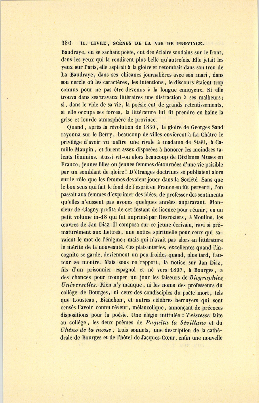 Quand, après la révolution de 1830, la gloire de Georges Sand rayonna sur le Berry, beaucoup de villes envièrent à La Châtre le privilége d’avoir vu naître une rivale à madame de Staël, à Camille Maupin, et furent assez disposées à honorer les moindres talents féminins. Aussi vit-on alors beaucoup de Dixièmes Muses en France, jeunes filles ou jeunes femmes détournées d’une vie paisible par un semblant de gloire ! D’étranges doctrines se publiaient alors sur le rôle que les femmes devaient jouer dans la Société. Sans que le bon sens qui fait le fond de l’esprit en France en fût perverti, l’on passait aux femmes d’exprimer des idées, de professer des sentiments qu’elles n’eussent pas avoués quelques années auparavant. Monsieur de Clagny profita de cet instant de licence pour réunir, en un petit volume in-18 qui fut imprimé par Desroziers, à Moulins, les œuvres de Jan Diaz. Il composa sur ce jeune écrivain, ravi si prématurément aux Lettres, une notice spirituelle pour ceux qui savaient le mot de l’énigme ; mais qui n’avait pas alors en littérature le mérite de la nouveauté. Ces plaisanteries, excellentes quand l’incognito se garde, deviennent un peu froides quand, plus tard, l’auteur se montre. Mais sous ce rapport, la notice sur Jan Diaz, fils d’un prisonnier espagnol et né vers 1807, à Bourges, a des chances pour tromper un jour les faiseurs de Biographies Universelles. Rien n’y manque, ni les noms des professeurs du collége de Bourges, ni ceux des condisciples du poète mort, tels que Lousteau, Bianchon, et autres célèbres berruyers qui sont censés l’avoir connu rêveur, mélancolique, annonçant de précoces dispositions pour la poésie. Une élégie intitulée : Tristesse faite au collége, les deux poèmes de Paquita la Sévillane et du Chêne de la messe, trois sonnets, une description de la cathédrale de Bourges et de l’hôtel de Jacques-Cœur, enfin une nouvelle {p. 387} intitulée Carola, donnée comme l’œuvre pendant laquelle il avait été surpris par la mort, formaient le bagage littéraire du défunt dont les derniers instants, pleins de misère et de désespoir, devaient serrer le cœur des êtres sensibles de la Nièvre, du Bourbonnais, du Cher et du Morvan où il avait expiré, près de Château-Chinon, inconnu de tous, même de celle qu’il aimait !… Ce petit volume jaune fut tiré à deux cents exemplaires, dont cent cinquante se vendirent, environ cinquante par département. Cette moyenne des âmes sensibles et poétiques dans trois départements de la France, est de nature à rafraîchir l’enthousiasme des auteurs sur la furia francese qui, de nos jours, se porte beaucoup plus sur les intérêts que sur les livres. Les libéralités de monsieur de Clagny faites, car il avait signé la notice, Dinah garda sept ou huit exemplaires enveloppés dans les journaux forains qui rendirent compte de cette publication. Vingt exemplaires envoyés aux journaux de Paris se perdirent dans le gouffre des bureaux de rédaction. Nathan, pris pour dupe, ainsi que plusieurs Berrichons, fit sur le grand homme un article où il lui trouva toutes les qualités qu’on accorde aux gens enterrés. Lousteau, rendu prudent par ses camarades de collége qui ne se rappelaient point Jan Diaz, attendit des nouvelles de Sancerre, et apprit que Jan Diaz était le pseudonyme d’une femme. On se passionna, dans l’arrondissement de Sancerre, pour madame de La Baudraye, en qui l’on voulut voir la future rivale de George Sand. Depuis Sancerre jusqu’à Bourges, on exaltait, on vantait le poème qui, dans un autre temps, eût été bien certainement honni. Le public de province, comme tous les publics français peut-être, adopte peu la passion du roi des Français, le juste-milieu : il vous met aux nues ou vous plonge dans la fange.