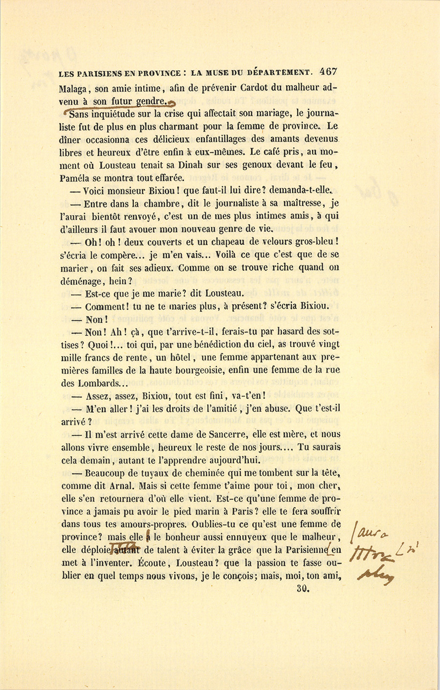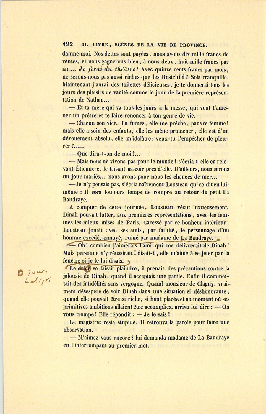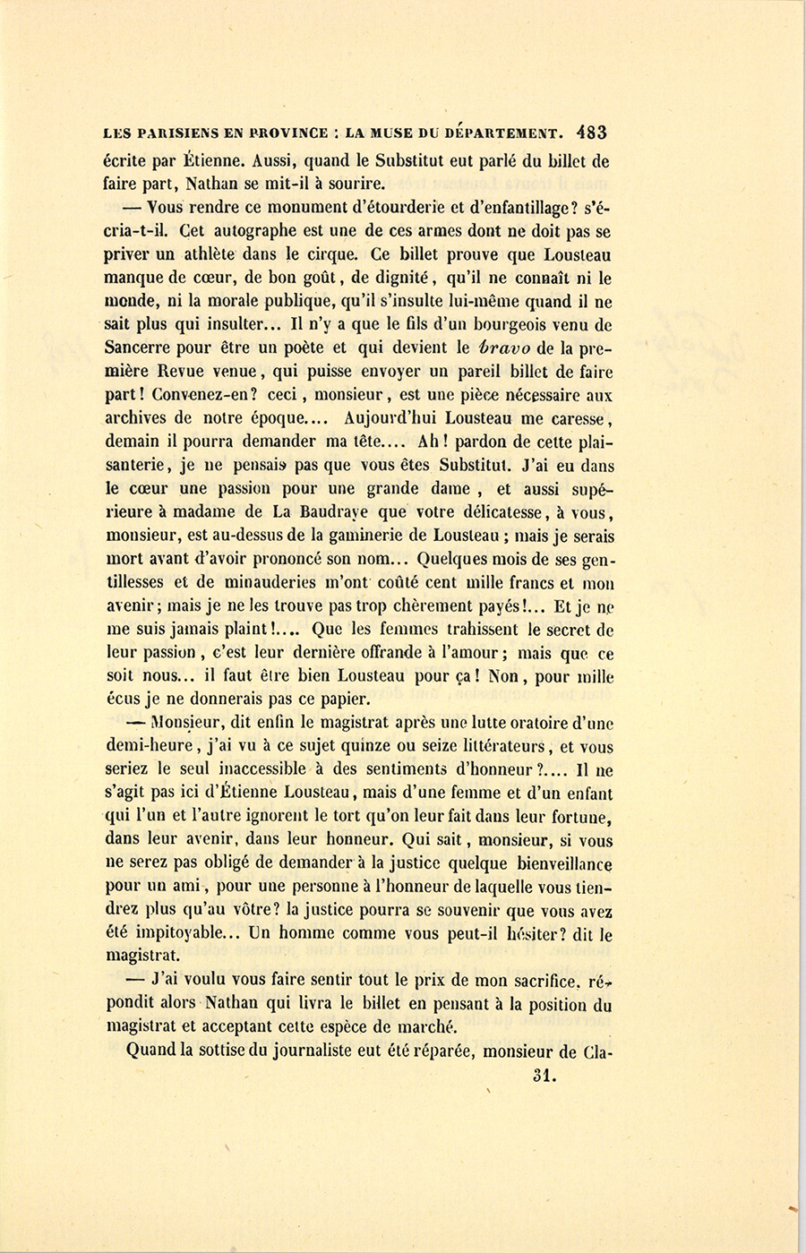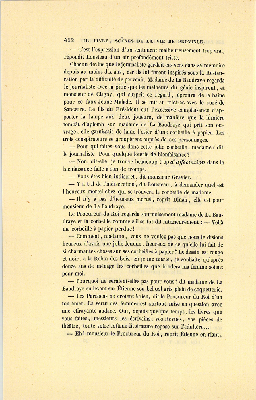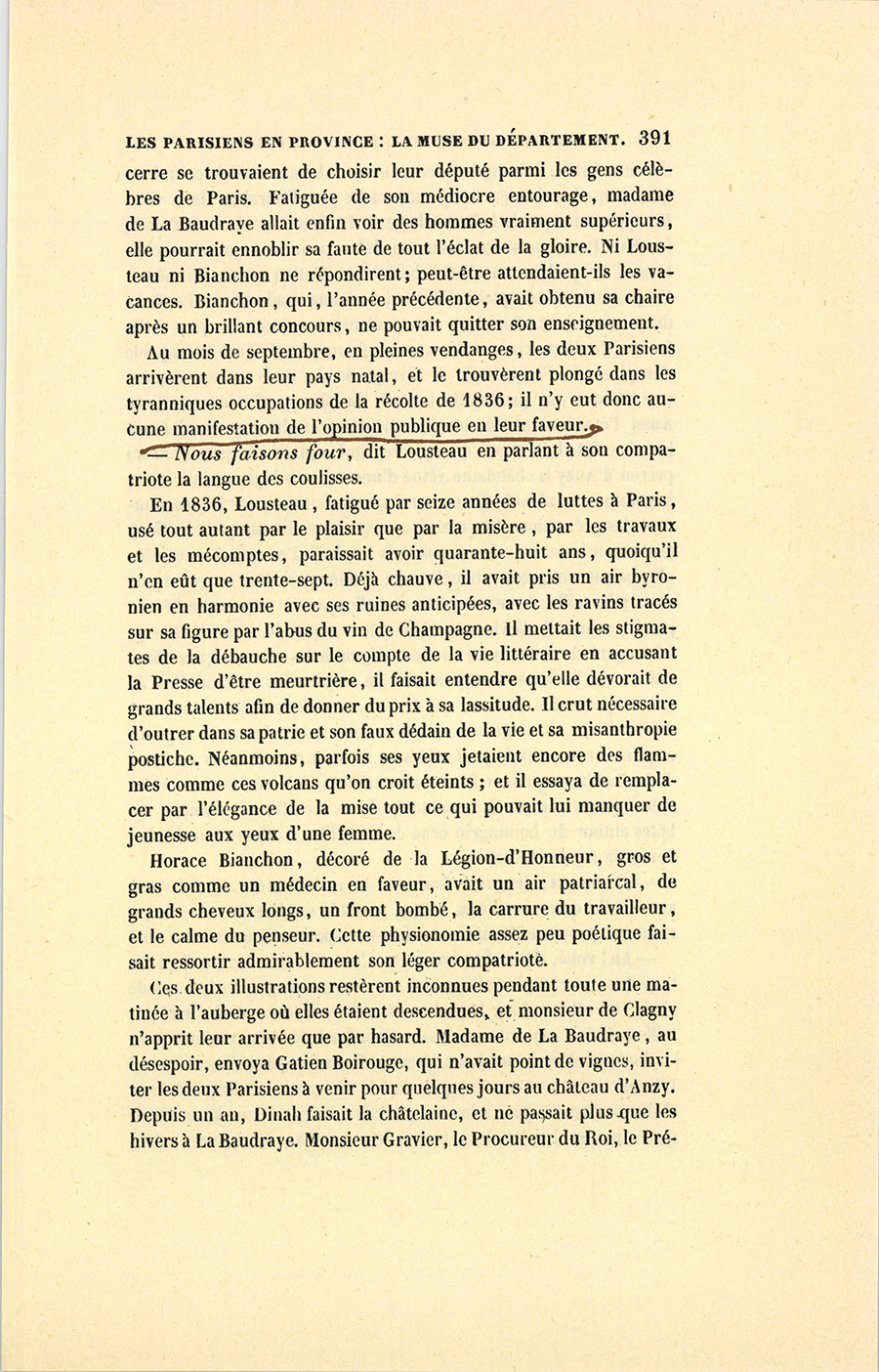 – Comment, demanda Lousteau le mystificateur, une femme aussi belle que vous l’êtes et qui paraît si supérieure, a-t-elle pu rester en province ? Comment faites-vous pour résister à cette vie ?