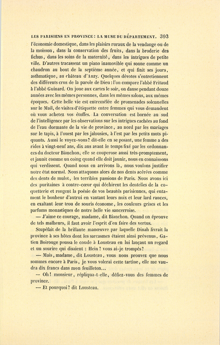 – Ah ! voilà, dit la châtelaine. On n’y résiste pas. Un profond désespoir ou une stupide résignation, ou l’un ou l’autre, il n’y a pas de choix, tel est le tuf sur lequel repose notre existence et où s’arrêtent mille pensées stagnantes qui, sans féconder le terrain, y nourrissent les fleurs étiolées de nos âmes désertes. Ne croyez pas à l’insouciance ! L’insouciance tient au désespoir ou à la résignation. Chaque femme s’adonne alors à ce qui, selon son caractère, lui paraît un plaisir. Quelques-unes se jettent dans les confitures et dans les lessives, dans {p. 393} l’économie domestique, dans les plaisirs ruraux de la vendange ou de la moisson, dans la conservation des fruits, dans la broderie des fichus, dans les soins de la maternité, dans les intrigues de petite ville. D’autres tracassent un piano inamovible qui sonne comme un chaudron au bout de la septième année, et qui finit ses jours, asthmatique, au château d’Anzy. Quelques dévotes s’entretiennent des différents crus de la parole de Dieu : l’on compare l’abbé Fritaud à l’abbé Guinard. On joue aux cartes le soir, on danse pendant douze années avec les mêmes personnes, dans les mêmes salons, aux mêmes époques. Cette belle vie est entremêlée de promenades solennelles sur le Mail, de visites d’étiquette entre femmes qui vous demandent où vous achetez vos étoffes. La conversation est bornée au sud de l’intelligence par les observations sur les intrigues cachées au fond de l’eau dormante de la vie de province, au nord par les mariages sur le tapis, à l’ouest par les jalousies, à l’est par les petits mots piquants. Aussi le voyez-vous ? dit-elle en se posant, une femme a des rides à vingt-neuf ans, dix ans avant le temps fixé par les ordonnances du docteur Bianchon, elle se couperose aussi très-promptement, et jaunit comme un coing quand elle doit jaunir, nous en connaissons qui verdissent. Quand nous en arrivons là, nous voulons justifier notre état normal. Nous attaquons alors de nos dents acérées comme des dents de mulot, les terribles passions de Paris. Nous avons ici des puritaines à contre-cœur qui déchirent les dentelles de la coquetterie et rongent la poésie de vos beautés parisiennes, qui entament le bonheur d’autrui en vantant leurs noix et leur lard rances, en exaltant leur trou de souris économe, les couleurs grises et les parfums monastiques de notre belle vie sancerroise.
