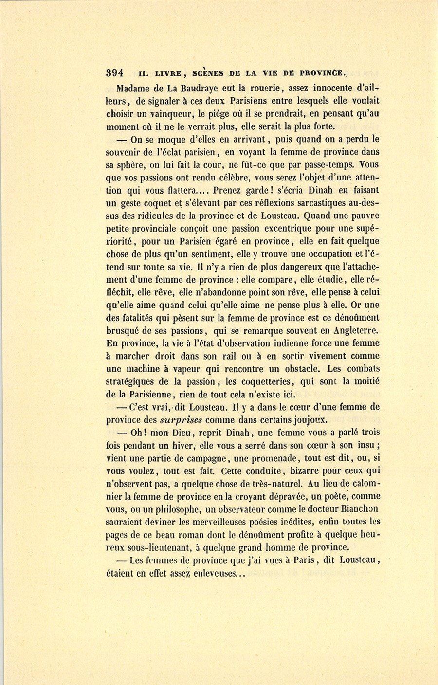– On se moque d’elles en arrivant, puis quand on a perdu le souvenir de l’éclat parisien, en voyant la femme de province dans sa sphère, on lui fait la cour, ne fût-ce que par passe-temps. Vous que vos passions ont rendu célèbre, vous serez l’objet d’une attention qui vous flattera… Prenez garde ! s’écria Dinah en faisant un geste coquet et s’élevant par ces réflexions sarcastiques au-dessus des ridicules de la province et de Lousteau. Quand une pauvre petite provinciale conçoit une passion excentrique pour une supériorité, pour un Parisien égaré en province, elle en fait quelque chose de plus qu’un sentiment, elle y trouve une occupation et l’étend sur toute sa vie. Il n’y a rien de plus dangereux que l’attachement d’une femme de province : elle compare, elle étudie, elle réfléchit, elle rêve, elle n’abandonne point son rêve, elle pense à celui qu’elle aime quand celui qu’elle aime ne pense plus à elle. Or une des fatalités qui pèsent sur la femme de province est ce dénoûment brusqué de ses passions, qui se remarque souvent en Angleterre. En province, la vie à l’état d’observation indienne force une femme à marcher droit dans son rail ou à en sortir vivement comme une machine à vapeur qui rencontre un obstacle. Les combats stratégiques de la passion, les coquetteries, qui sont la moitié de la Parisienne, rien de tout cela n’existe ici.