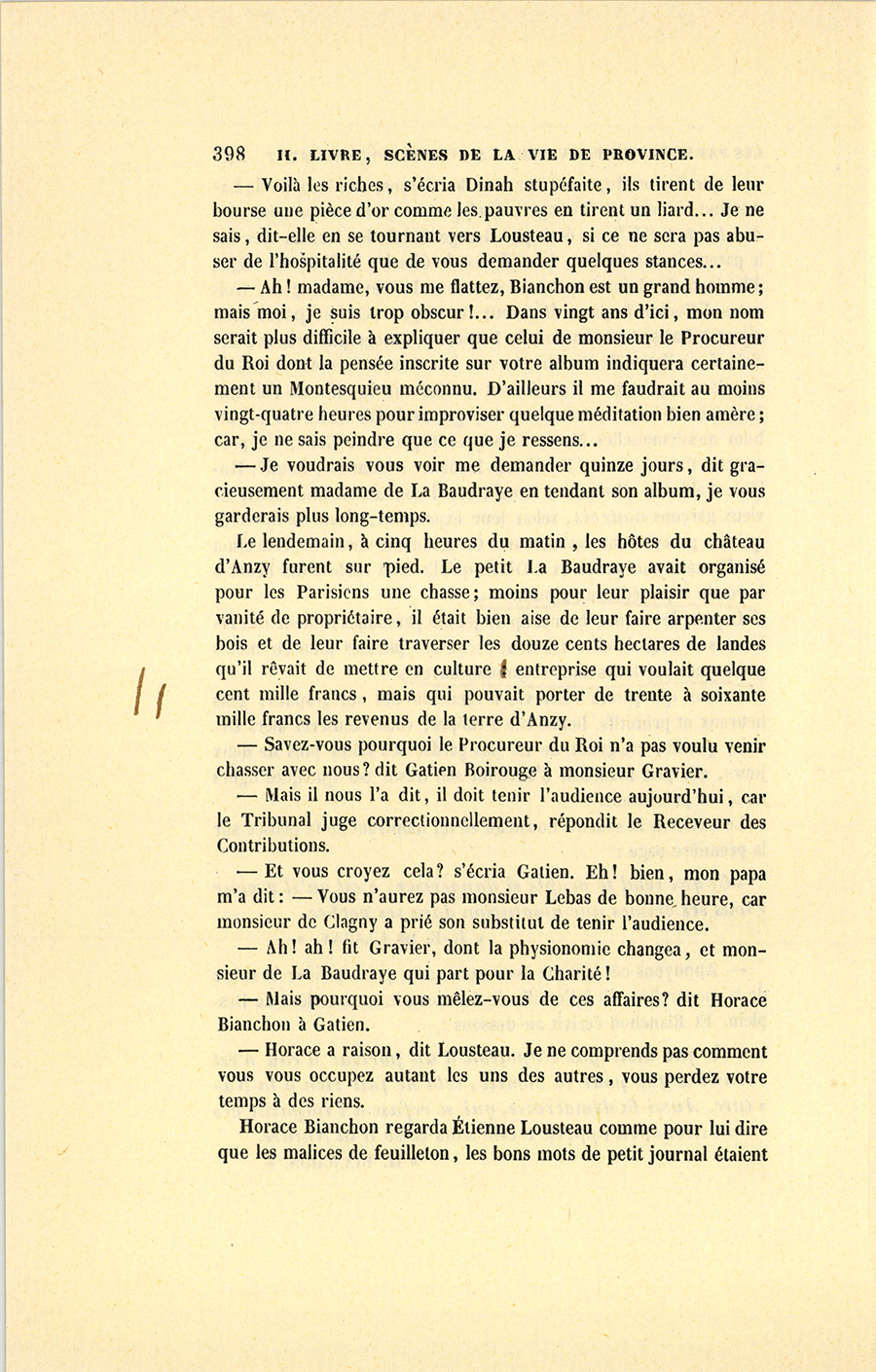 Gatien Boirouge trouva moyen de dire à madame de La Baudraye le mot du feuilletoniste, pendant le dîner qui fut plantureux, sinon splendide, et pendant lequel la châtelaine eut soin de peu parler. Cette langueur dans la conversation révéla l’indiscrétion de Gatien. Étienne essaya de rentrer en grâce, mais toutes les prévenances de Dinah furent pour Bianchon. Néanmoins, au milieu de la soirée, la baronne redevint gracieuse pour Lousteau. N’avez-vous pas remarqué combien de grandes lâchetés sont commises pour de petites choses ? Ainsi cette noble Dinah, qui ne voulait pas se donner à des sots, qui menait au fond de sa province une épouvantable vie de luttes, de révoltes réprimées, de poésies inédites, et qui venait de gravir, pour s’éloigner de Lousteau, la roche la plus haute et la plus escarpée de ses dédains, qui n’en serait pas descendue en voyant ce faux Byron à ses pieds lui demandant merci, dégringola soudain de cette hauteur en pensant à son album. Madame de La Baudraye avait donné dans la manie des autographes : elle possédait un volume oblong qui méritait d’autant mieux son nom, que les deux tiers des feuillets étaient blancs. La baronne de Fontaine, à qui elle l’avait envoyé pendant trois mois, obtint avec beaucoup de peine une ligne de Rossini, six mesures de Meyerbeer, les quatre {p. 397} vers que Victor Hugo met sur tous les albums, une strophe de Lamartine, un mot de Béranger, Calypso ne pouvait se consoler du départ d’Ulysse écrit par George Sand, les fameux vers sur le parapluie par Scribe, une phrase de Charles Nodier, une ligne d’horizon de Jules Dupré, la signature de David d’Angers, trois notes d’Hector Berlioz. Monsieur de Clagny récolta, pendant un séjour à Paris, une chanson de Lacenaire, autographe très recherché, deux lignes de Fieschi, et une lettre excessivement courte de Napoléon, qui toutes trois étaient collées sur le vélin de l’album. Monsieur Gravier, pendant un voyage, avait fait écrire sur cet album mesdemoiselles Mars, Georges, Taglioni et Grisi, les premiers artistes, comme Frédérick-Lemaître, Monrose, Bouffé, Rubini, Lablache, Nourrit et Arnal ; car il connaissait une société de vieux garçons nourris, selon leur expression, dans le Sérail, qui lui procurèrent ces faveurs. Ce commencement de collection fut d’autant plus précieux à Dinah qu’elle était seule à dix lieues à la ronde à posséder un album. Depuis deux ans, beaucoup de jeunes personnes avaient des albums sur lesquels elles faisaient écrire des phrases plus ou moins grotesques par leurs amis et connaissances. Ô vous qui passez votre vie à recueillir des autographes, gens heureux et primitifs, hollandais à tulipes, vous excuserez alors Dinah, quand, craignant de ne pas garder ses hôtes plus de deux jours, elle pria Bianchon d’enrichir son trésor par quelques lignes en le lui présentant.