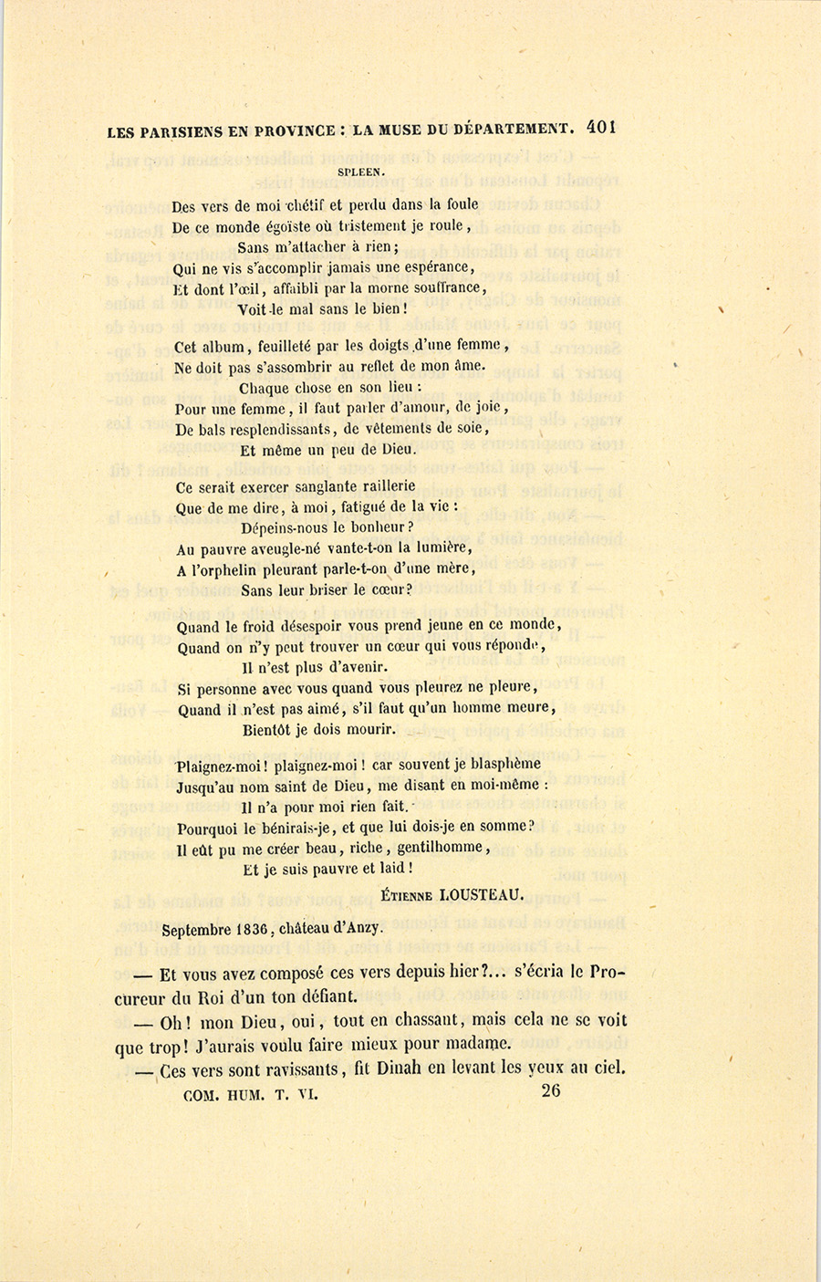 Mise à bout de sa patience et de sa résignation par le départ du vicomte de Chargebœuf, Dinah suivit le conseil du bon abbé Duret qui lui dit de convertir ses mauvaises pensées en poésie ; ce qui peut-être explique certains poètes.