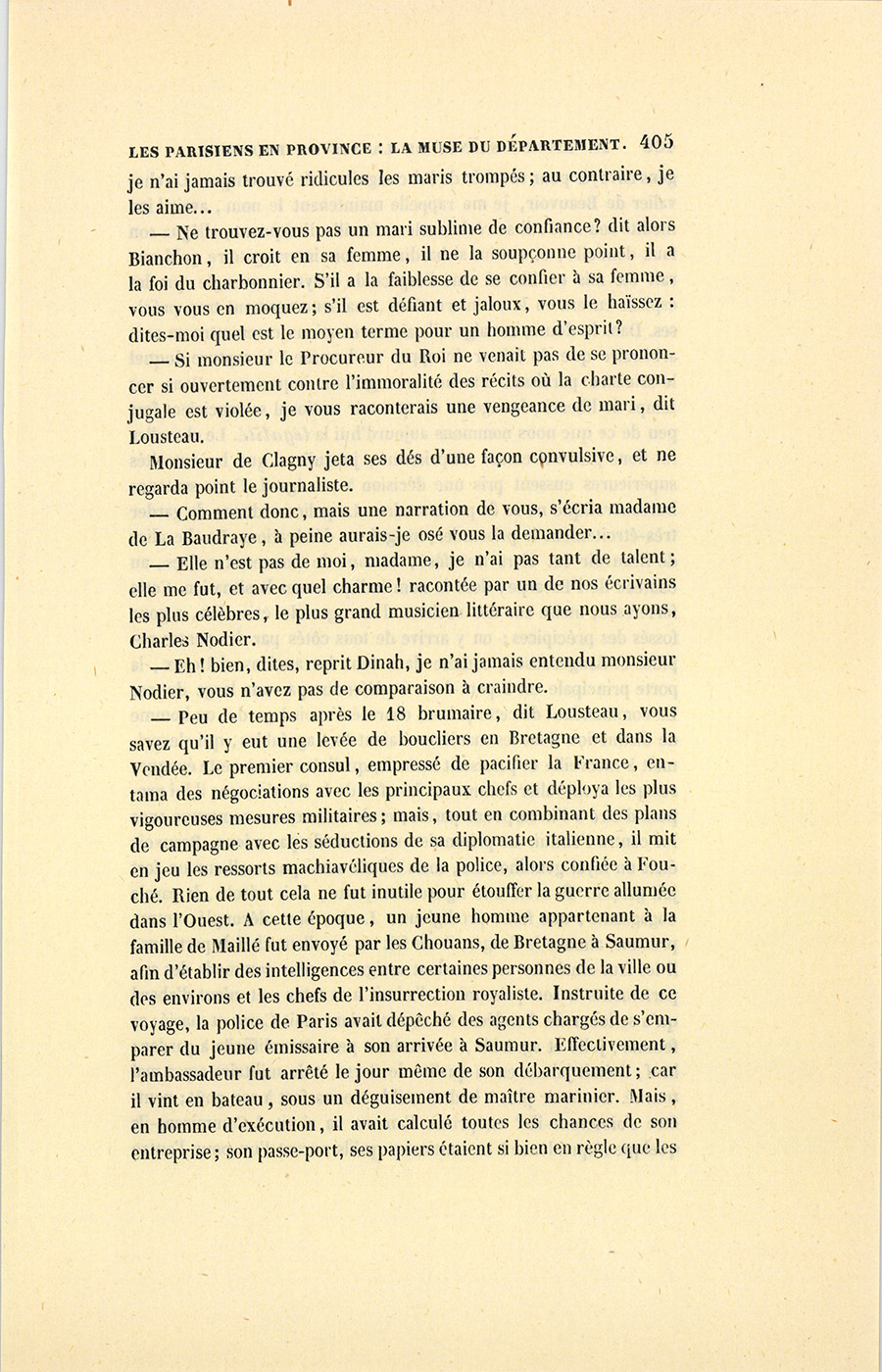 Dix jours après cette conférence, l’hôtel de La Baudraye était fermé. La comtesse et ses enfants, sa mère, enfin toute sa maison, qu’elle avait augmentée d’un précepteur, était partie pour le Sancerrois où Dinah voulait passer la belle saison. Elle fut charmante, dit-on, pour le comte. Ainsi, la muse de Sancerre revenait tout bonnement à la Famille et au Mariage ; mais, selon quelques médisants, elle était forcée d’y revenir, car les désirs du petit pair de France seraient sans doute accomplis, il attendait une fille !…