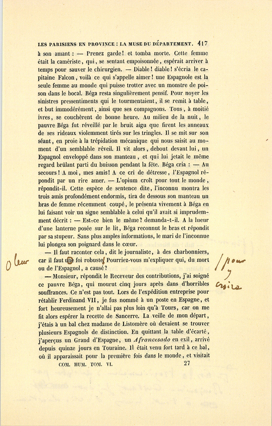 Ce ton, l’accent, le regard indifférent, tout frappa si durement cette femme qui vivait uniquement par son amour, qu’elle laissa couler de ses yeux le long de ses joues deux grosses larmes sans {p. 490} répondre, et Lousteau ne s’en aperçut qu’au moment où elle prit son mouchoir pour essuyer ces deux perles de douleur.