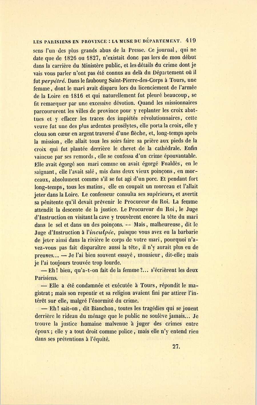 Au commencement de l’année 1842, madame de La Baudraye28, en se sentant toujours prise comme pis-aller, en était revenue à s’immoler au bien-être de Lousteau : elle avait repris les vêtements noirs ; mais elle arborait cette fois un deuil, car ses plaisirs se changeaient en remords. Elle avait trop souvent honte d’elle-même pour ne pas sentir parfois la pesanteur de sa chaîne, et sa mère la surprit en ces moments de réflexion profonde où la vision de l’avenir plonge les malheureux dans une sorte de torpeur. Madame Piédefer, conseillée par son confesseur, épiait le moment de lassitude que ce prêtre lui prédisait devoir arriver, et sa voix plaidait alors pour les enfants. Elle se contentait de demander une séparation de domicile sans exiger une séparation de cœur. Dans la nature, ces sortes de situations violentes ne se terminent pas, comme dans les livres, par la mort ou par des catastrophes habilement arrangées ; elles finissent beaucoup moins poétiquement par le dégoût, par la flétrissure de toutes les fleurs de l’âme, par la vulgarité des habitudes, mais très-souvent aussi par une autre passion qui dépouille une femme de cet intérêt dont on entoure traditionnellement les femmes. Or, quand le bon sens, la loi des convenances sociales, l’intérêt de famille, tous les éléments de ce qu’on appelait la morale publique sous la Restauration, en haine du mot Religion catholique, fut appuyé par le sentiment de blessures un peu trop vives ; quand la lassitude du dévouement arriva presque à la défaillance, et que, dans cette situation, un coup par trop violent, une de ces lâchetés que les hommes ne laissent voir qu’à des femmes dont ils se croient toujours maîtres, met le comble au dégoût, au désenchantement, l’heure est arrivée pour l’ami qui poursuit la guérison. {p. 497} Madame Piédefer eut donc peu de chose à faire pour détacher la taie aux yeux de sa fille. Elle envoya chercher l’Avocat-Général. Monsieur de Clagny acheva l’œuvre en affirmant à madame de La Baudraye que, si elle renonçait à vivre avec Étienne, son mari lui laisserait ses enfants, lui permettrait d’habiter Paris et lui rendrait la disposition de ses propres.