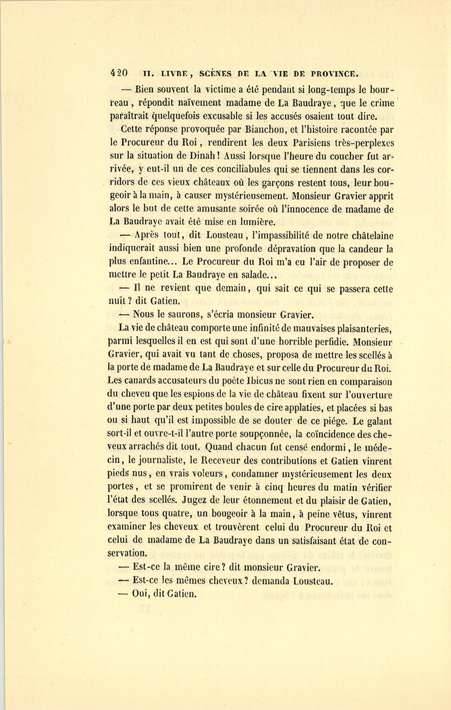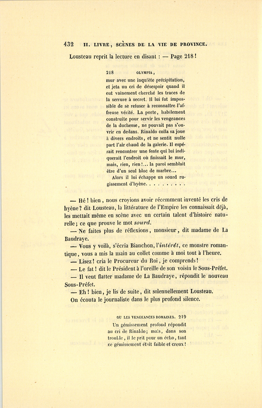 – Cela s’explique, dit le Président Boirouge, le petit homme aurait, m’a-t-on dit, été très-choqué d’avoir entendu, sur le Mail, le beau monsieur Milaud, le Substitut de Nevers, disant à monsieur {p. 362} de Clagny en lui montrant les tourelles de La Baudraye : – Cela me reviendra ! – Mais, a répondu notre Procureur du Roi, il peut se marier et avoir des enfants. – Ça lui est défendu ! Vous pouvez imaginer la haine qu’un avorton comme le petit La Baudraye a dû vouer à ce colosse de Milaud.