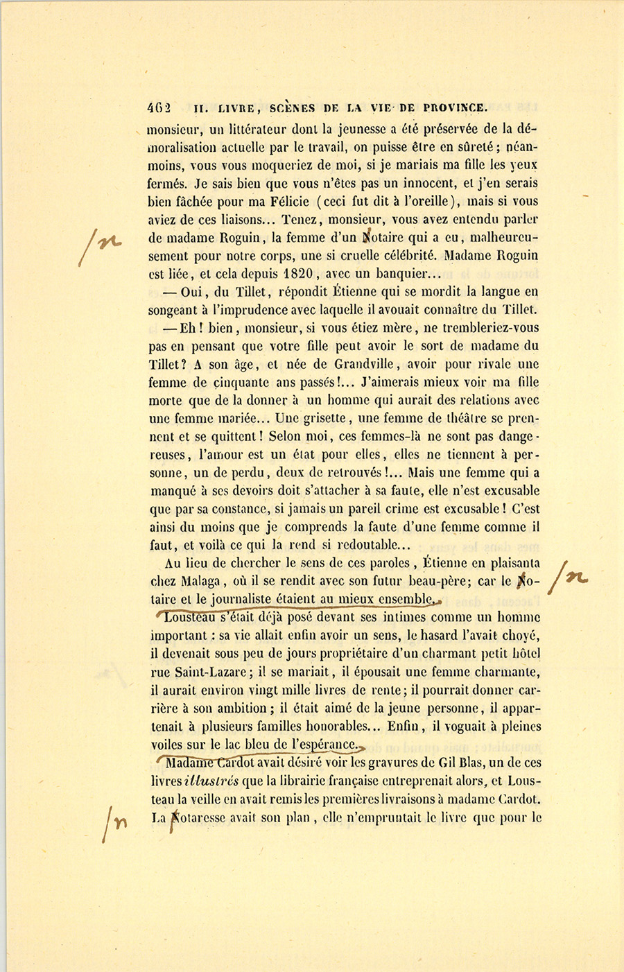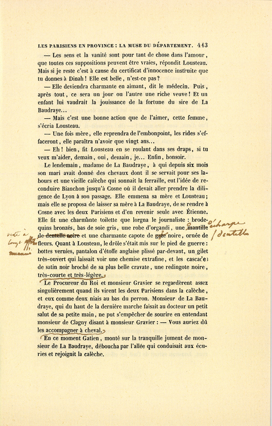 La réputation de Lousteau, qui passait pour un homme à bonnes fortunes à cause de ses liaisons avec des actrices, frappa madame de La Baudraye ; elle voulut le connaître, elle lut ses ouvrages et se passionna pour lui, moins peut-être à cause de son talent qu’à cause de ses succès auprès des femmes ; elle inventa, pour l’amener dans le pays, l’obligation pour Sancerre d’élire aux prochaines Élections une des deux célébrités du pays. Elle fit écrire à l’illustre médecin par Gatien Boirouge, qui se disait cousin de Bianchon par les Popinot ; puis elle obtint d’un vieil ami de feu madame Lousteau de réveiller l’ambition du feuilletoniste en lui faisant part des intentions où quelques personnes de {p. 391} Sancerre se trouvaient de choisir leur député parmi les gens célèbres de Paris. Fatiguée de son médiocre entourage, madame de La Baudraye allait enfin voir des hommes vraiment supérieurs, elle pourrait ennoblir sa faute de tout l’éclat de la gloire. Ni Lousteau ni Bianchon ne répondirent ; peut-être attendaient-ils les vacances. Bianchon, qui, l’année précédente, avait obtenu sa chaire après un brillant concours, ne pouvait quitter son enseignement.