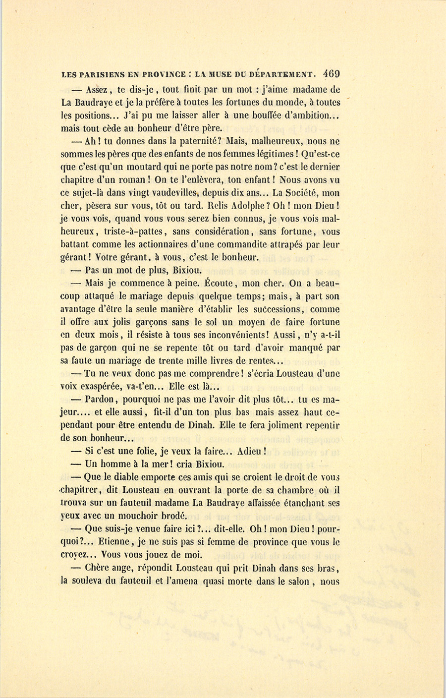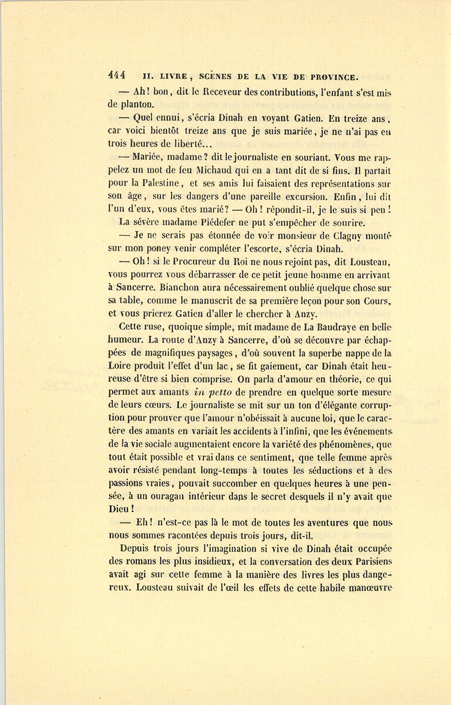 – Oh ! mon Dieu, reprit Dinah, une femme vous a parlé trois fois pendant un hiver, elle vous a serré dans son cœur à son insu ; vient une partie de campagne, une promenade, tout est dit, ou, si vous voulez, tout est fait. Cette conduite, bizarre pour ceux qui n’observent pas, a quelque chose de très-naturel. Au lieu de calomnier la femme de province en la croyant dépravée, un poète, comme vous, ou un philosophe, un observateur comme le docteur Bianchon sauraient deviner les merveilleuses poésies inédites, enfin toutes les pages de ce beau roman dont le dénoûment profite à quelque heureux sous-lieutenant, à quelque grand homme de province.