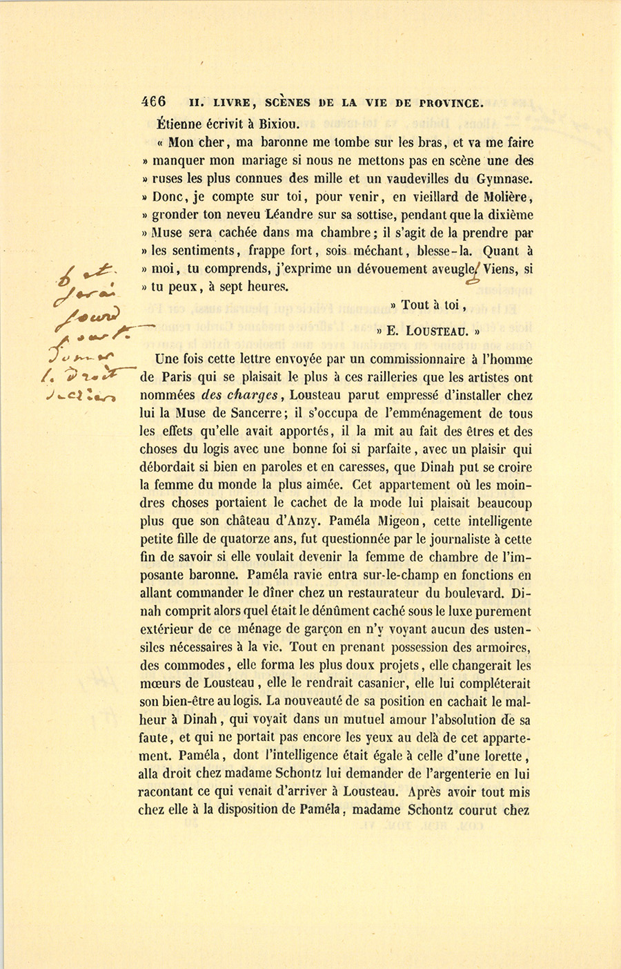 Un beau jour, en mai 1842, madame de La Baudraye paya toutes les dettes de son ménage, et laissa mille écus sur la liasse de tous les comptes acquittés. Après avoir envoyé sa mère et ses enfants à l’hôtel de La Baudraye29, elle attendit Lousteau tout habillée, comme pour sortir. Quand l’ex-roi de son cœur rentra pour dîner, elle lui dit : – J’ai renversé la marmite, mon ami. Madame de La Baudraye vous donne à dîner au Rocher de Cancale. Venez ?